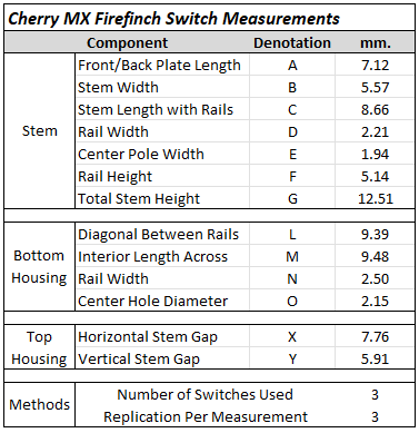 - There was again a slight increase in the stem wobble of the Cherry MX Firefinches that were broken out to this point, with it being more noticeable in the E/W direction than the N/S direction.
