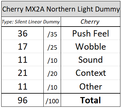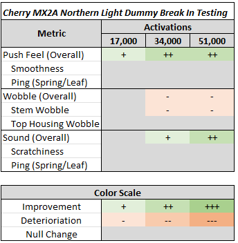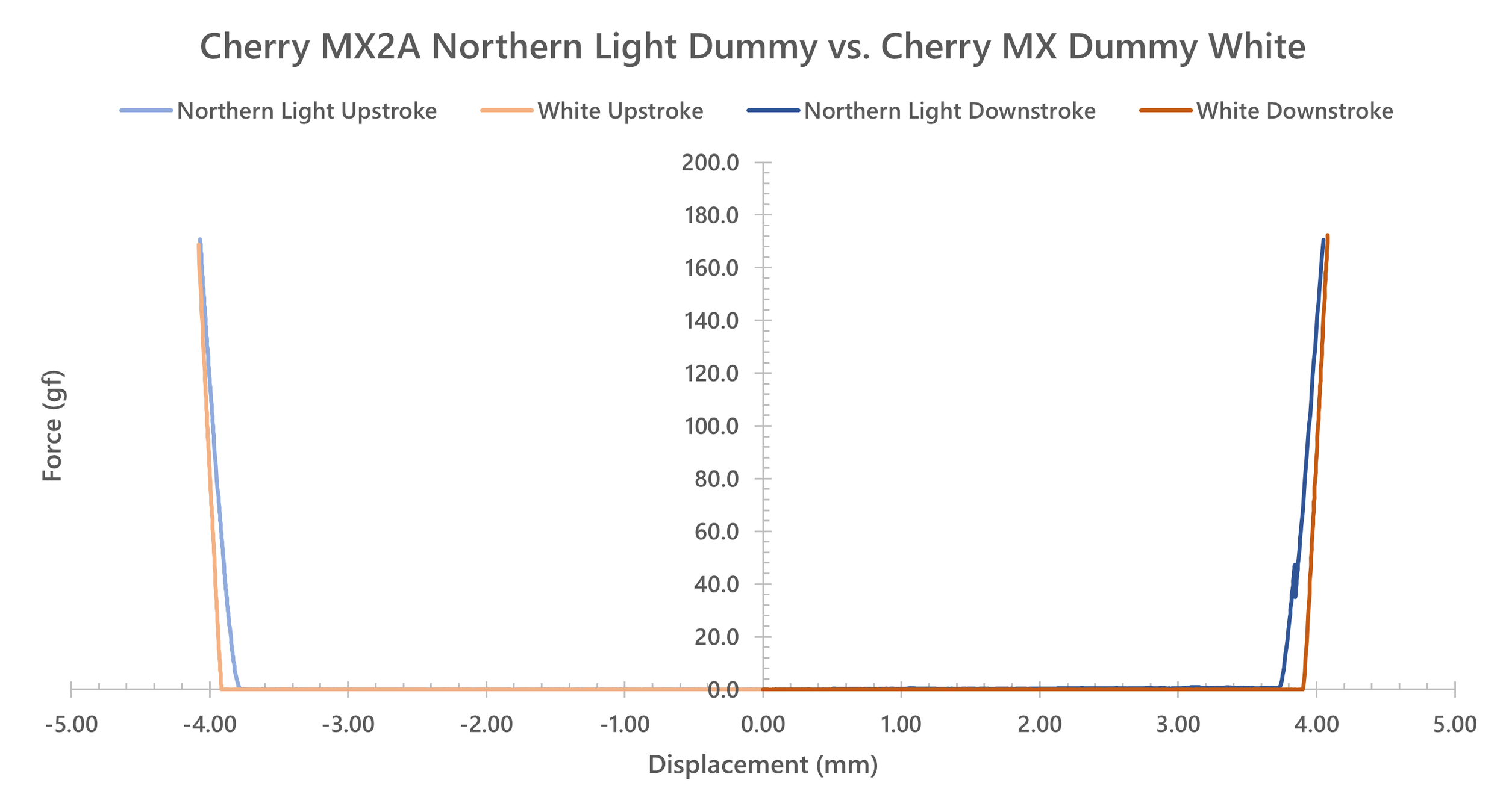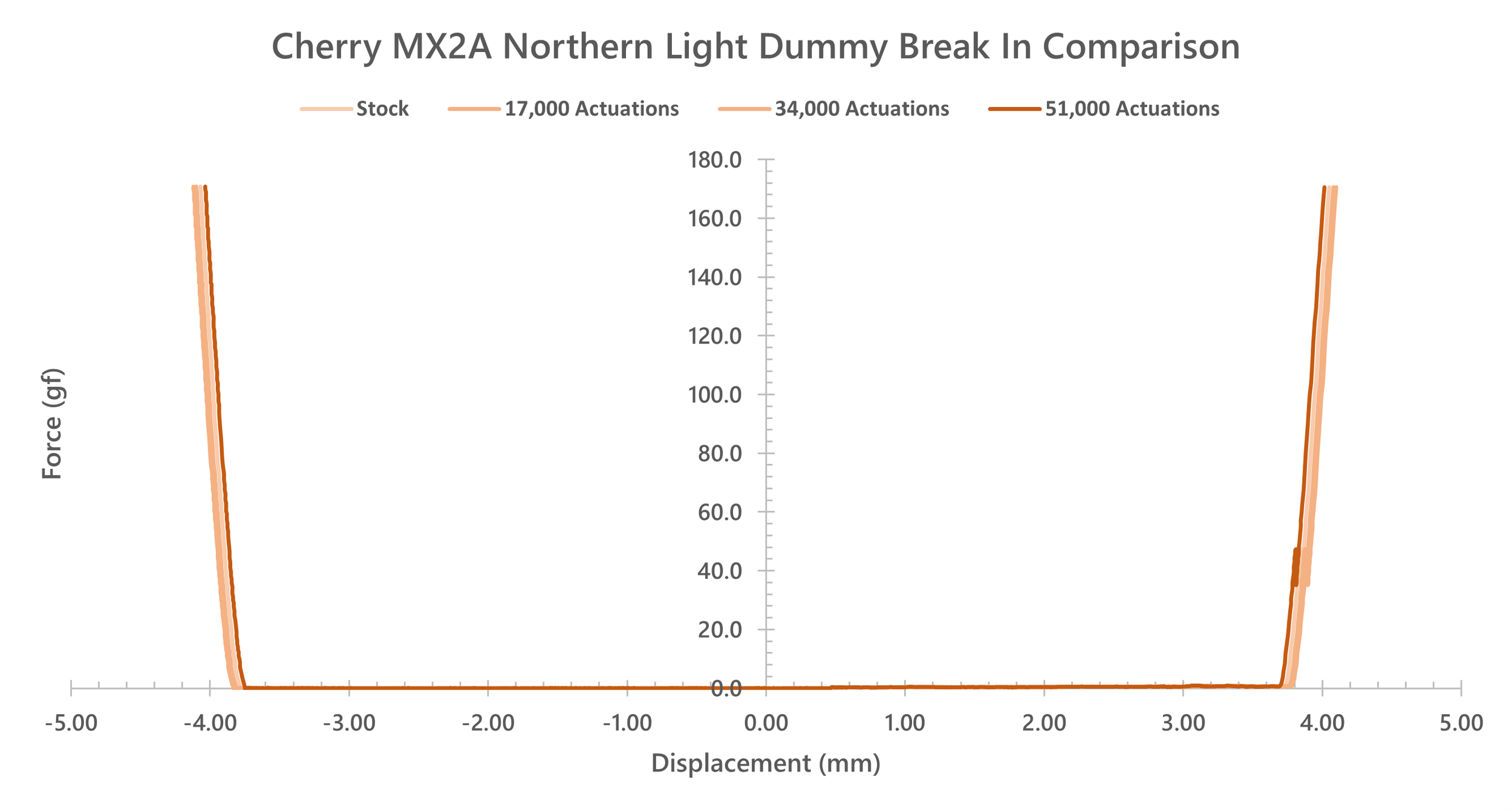 - After 17,000 actuations, the Cherry MX2A Northern Light Dummy switches hardly changed at all as compared to their stock counterparts. The only difference that was even slightly noticeable was an overall decrease in the more ‘sticky’ tones at bottom out of the switches that were broken in to this degree, though these were already fairly minimal to begin with on account of there being no lube caught between their non-existent springs and bottom housings.