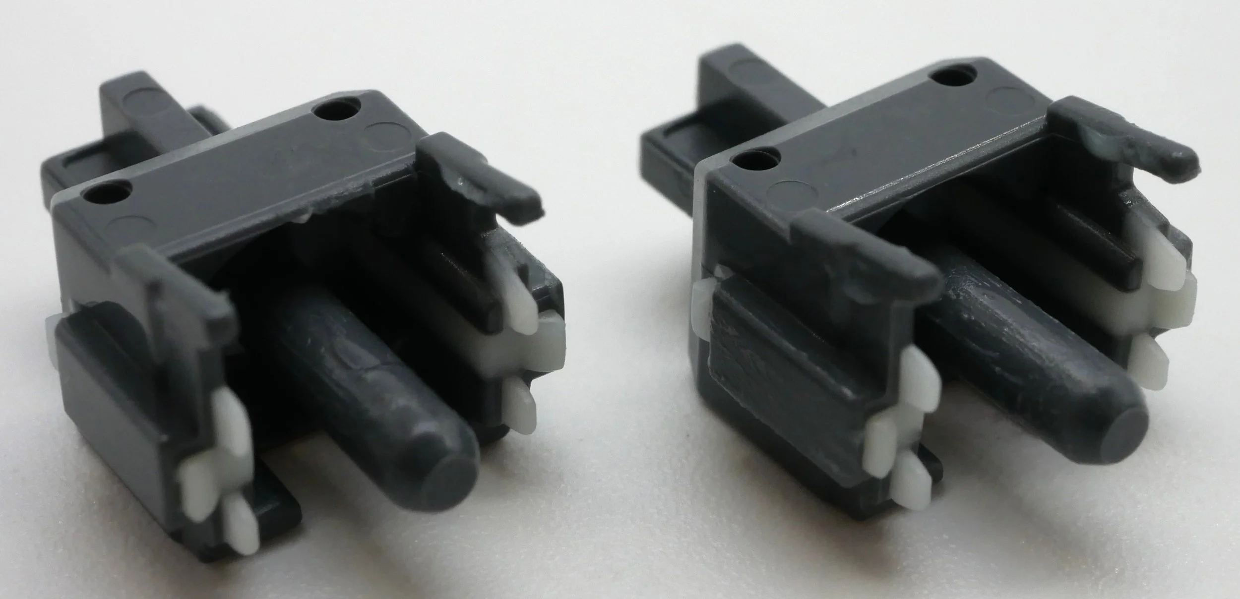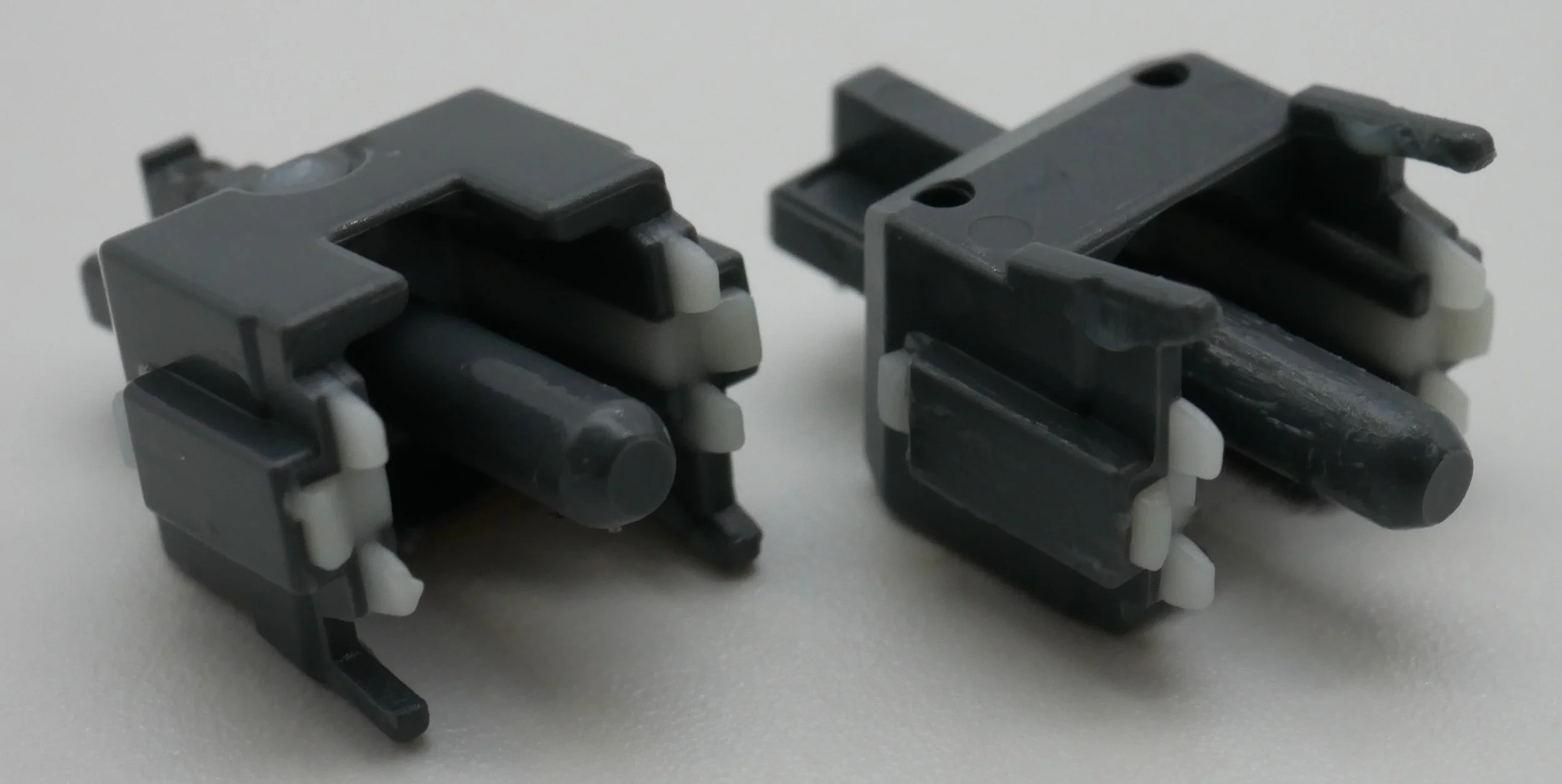 Figure 10: Cherry MX2A Northern Light Dummy switch stems back and front showing non-tapered slider rails, a normal length, slightly rounded stem pole, and special dampening pads designed to better handle bottom outs of large, stabilized keys.