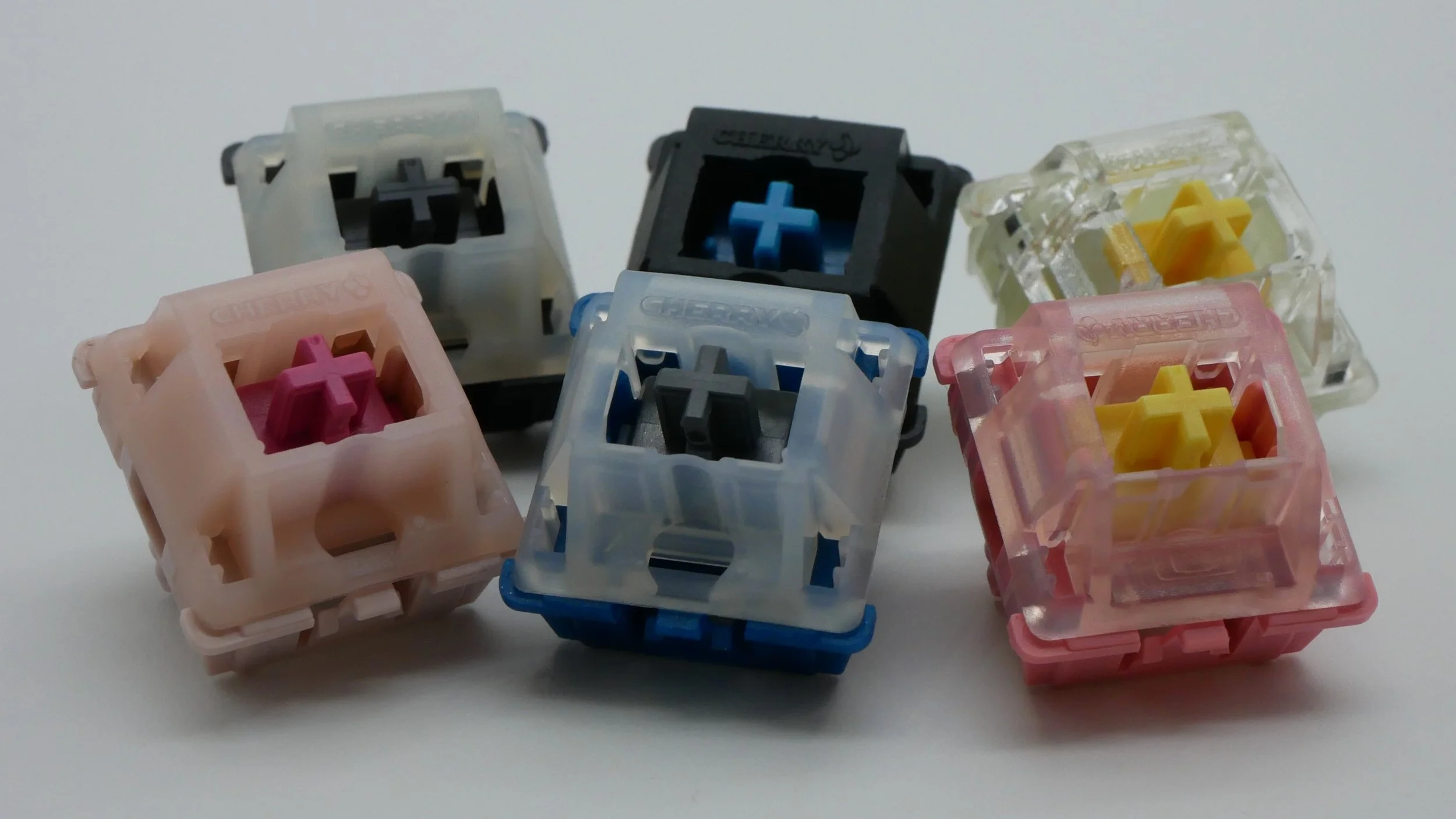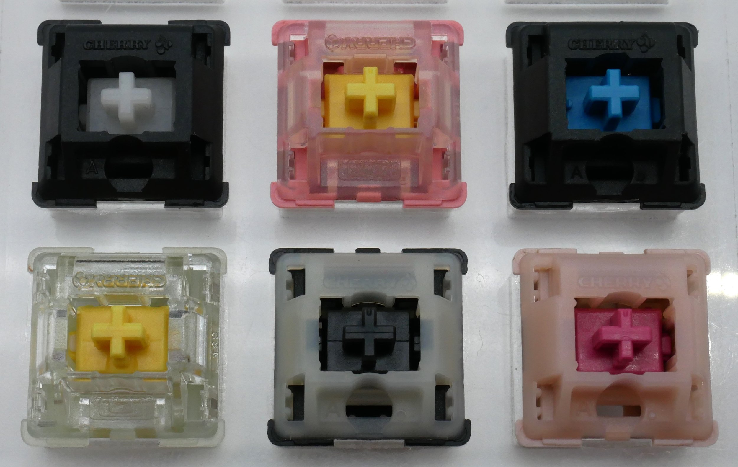 Figure 21: Switches for comparison. (L-R, Top-Bot: Cherry MX White Dummy, Cherry MX2A Blossom Dummy, Cherry MX2A Blue Dummy, Cherry MX2A Honey Dummy, Cherry MX2A New Nixie Dummy, and Cherry MX2A Petal Dummy)