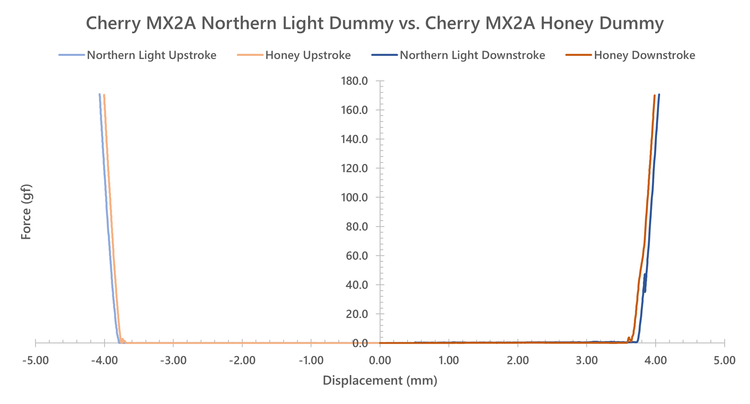 Unlike some of my more normal means of testing switches for full length reviews, the MX2A Northern Light Dummy switches are ones I can’t really just pick up and type away on in hand or between two fingers. With no spring in them to properly return the stem, just pulling and pushing the stems to and fro with a small pair of pliers hardly compares to the feeling of using them with a key attached. And so, after affixing a key to them, I was pleasantly surprised at just how smooth these switches were. Despite the subtle differences in structure and material choices as noted above, its clear that Cherry went about lubing the MX2A Northern Light Dummy switches via the same lubing techniques that were using on the other switches in the MX2A platform, giving them a fairly smooth and consistently smooth feeling with only small pickets of finer grain scratch. In fact, I’d go as far as to say that these switches come across slightly more effortlessly smooth than their non-Dummy counterparts on account of them not having excess lube trapped in their housings by the barrel-shaped springs used in conventional MX2A switches. As for the housing collisions of the MX2A Northern Light Dummy switches, these too are deep and clearly on the firmer end towards the bottom out on account of the fiberglass-reinforced nylon bottom housings used by Cherry. Where these switches really get their kick, though, is at the front end of their bottom out when the Impiolex G material begins its deformation under force. While this is incredibly hard to describe in any coherent words, it is almost as if the dampening pads of the stems of these switches just perfectly dampen the force of whatever they are struck with, no matter what they are struck with. In a way, I think that the actual technical term that may apply here would be “Non Newtonian-like”, but it’s not as if these stems are meltingly soft under light taps nor turning into bricks under forceful blows either. (I mean the force curve below clearly does show that these switches do deform somewhat at bottom out as can be seen in the subtle curve in force at bottom out as is common in silent switches.) Under just a single 1u key and all the way up to a 10u spacebar, these dampening pads just perfectly conform to the force of each key striking them, acting black hole-like in sucking in that force. Ironically enough, I can’t help but recognize that this is the exact sort of phrasing that I’ve used before to describe the bottom outs of normal Cherry switches with their depe, thick nylon housings before.