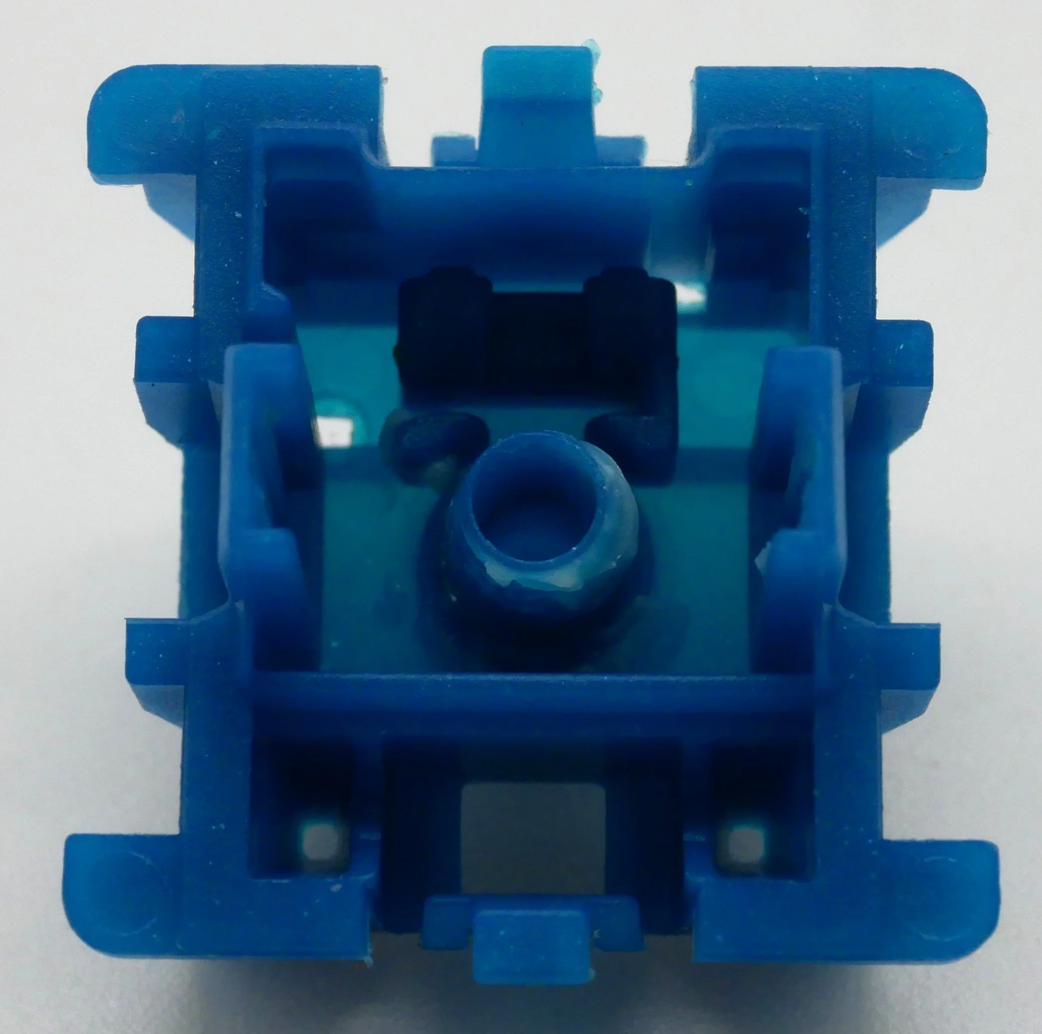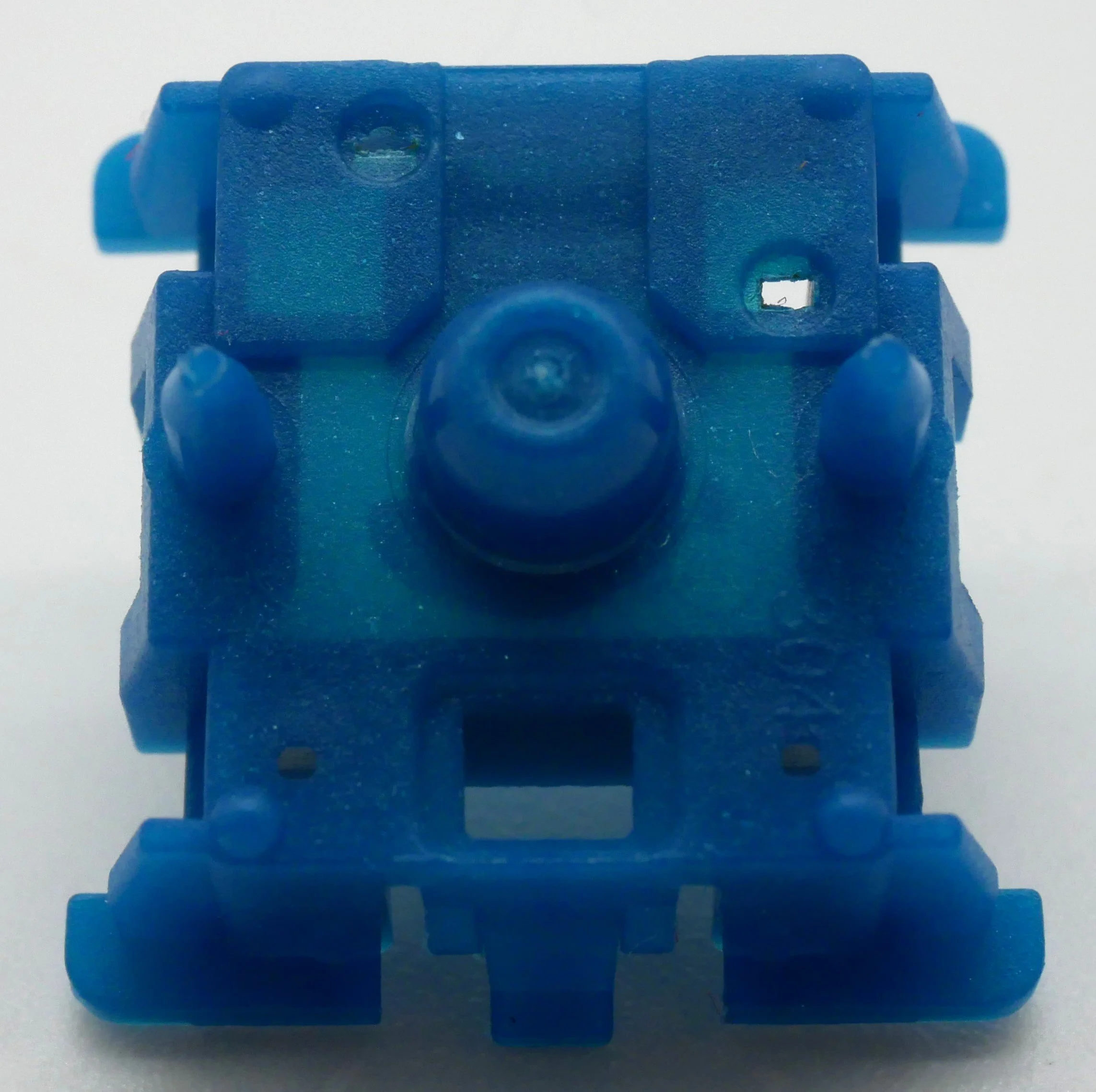 Finally arriving at the sparkly, nebula blue glass-fiber reinforce bottom housings of the Cherry MX2A Northern Light Dummy switches, we’re greeted with the details that truly surprised me in the design of these switches. While none of the commonplace features for the MX2A switch platform being here surprised me – such as the raised sections within the slider rails or the more rounded “socket dome” structure of the center pole hole – it was the presence of the complex geometry and through-housing holes on the northern side of the housing interior that were a shock to see. Without a need for Cherry’s gold cross point technology leaves in dummy type switches, I suppose I would have expected these little outcroppings used to hold in the leaves in the normal switches would have been eliminated. Yet they still appear here in their fullest form, leading me to believe that the “new mold” claim was broadly overstated and really only applied to the molds required for injecting the dampening pads on the stems. Or, perhaps this was intentionally done by Cherry in order to help keep the sound profile of the MX2A Dummy switches more consistent and uniform with that of their matching normal MX2A switch counterparts, something which I suppose makes sense given the stem dampening force rebalancing efforts described by the C-Lab team above. Externally all of the features of the Cherry MX2A Northern Light Dummy switches align with their non-Dummy (or would it better be stated as ‘Smart’?) counterparts, including PCB mounting pins, a three number mold marking, and a through switch, small squared-off LED hole that is all in the exact same places.