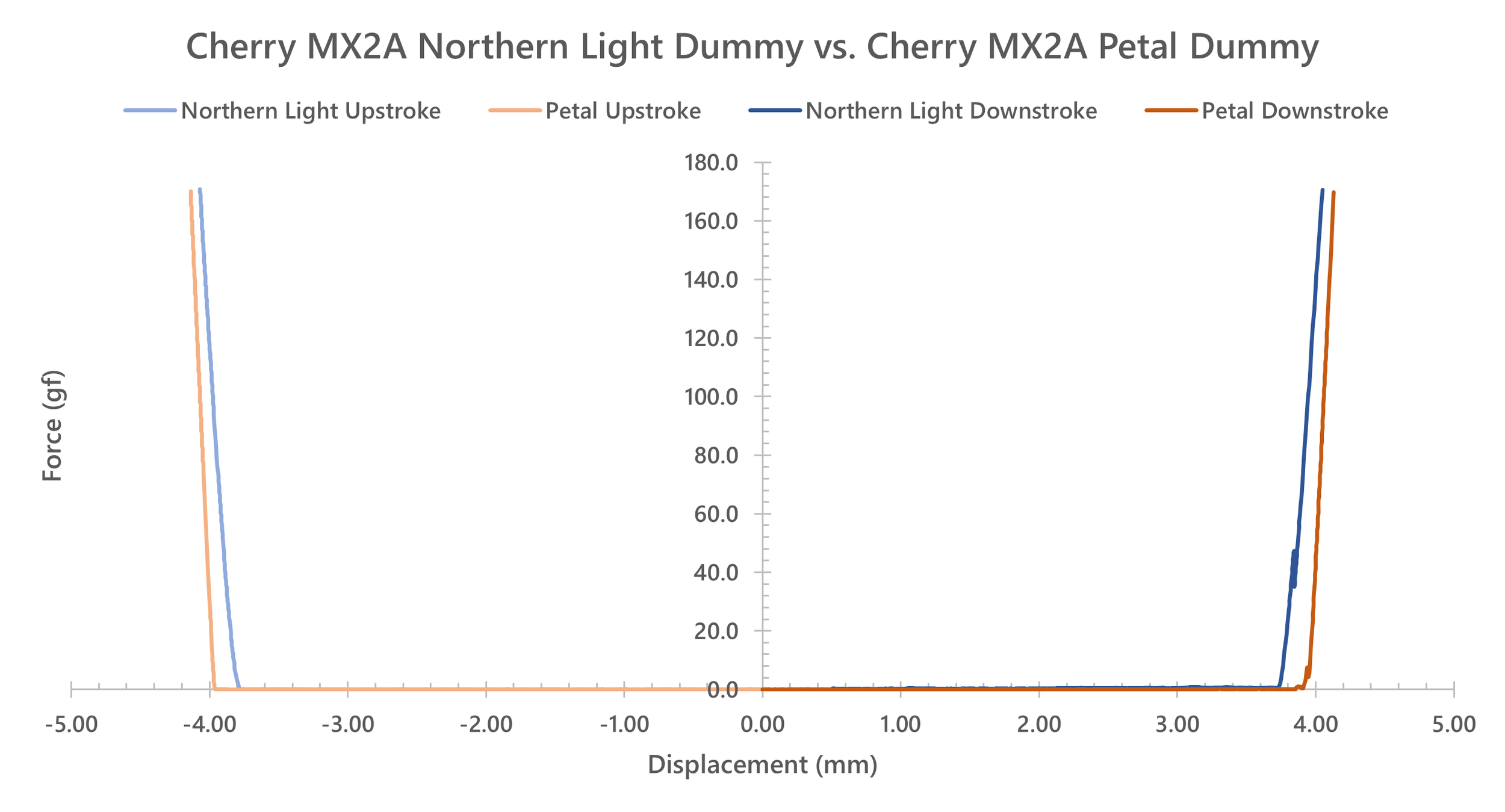 - The Cherry MX2A Northern Light switches have a tiny bit greater N/S stem wobble than the MX2A Petal Dummy switches for similar reasoning as described in the comparison to the Cherry MX2A Honey Dummy switches above.