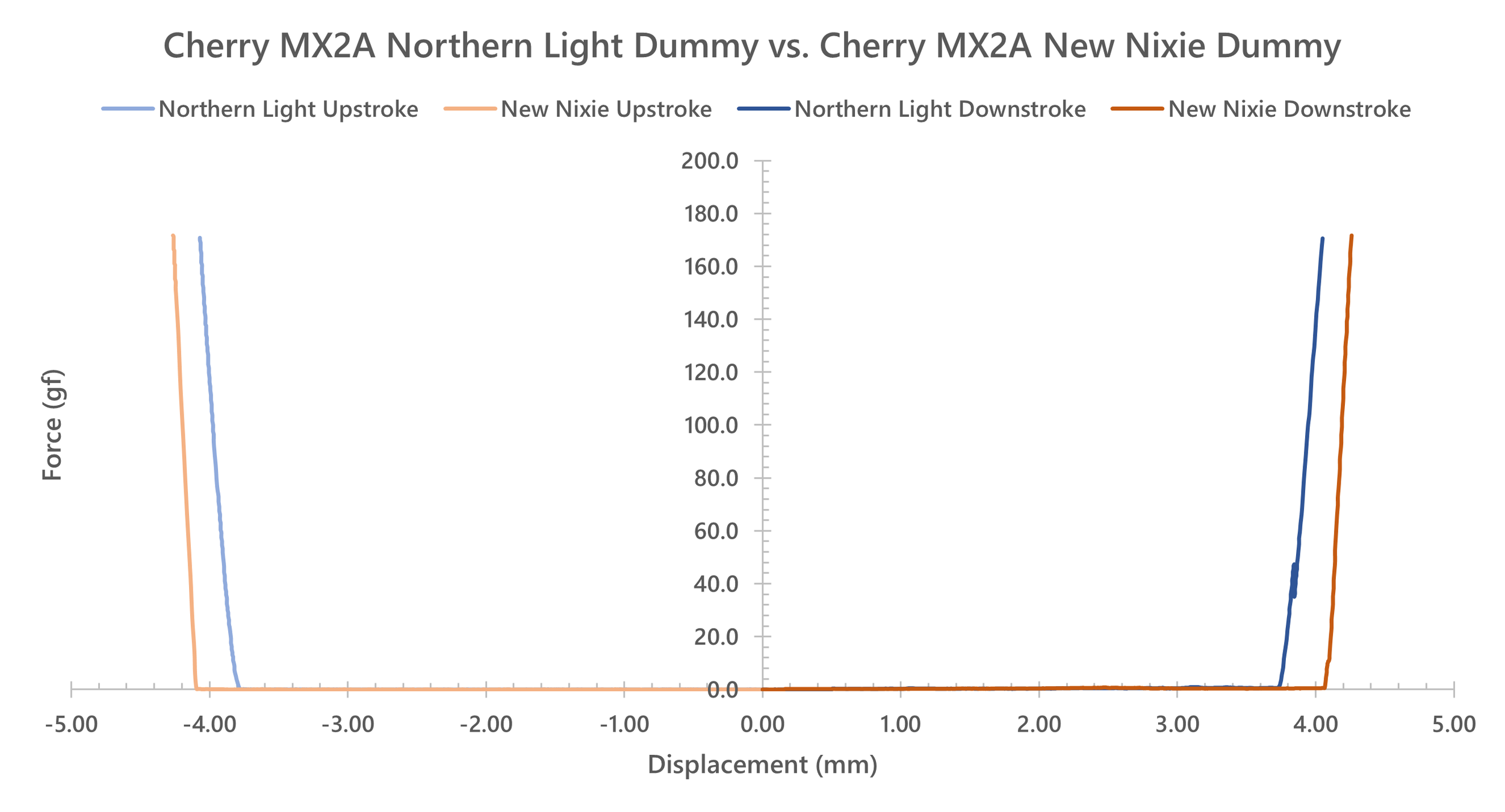 - Despite both being lubed on Cherry’s MX2A platform, the MX2A Northern Light Dummy switches are quite a bit smoother and consistently smooth across the batch that I received than the MX2A New Nixie Dummy switches.