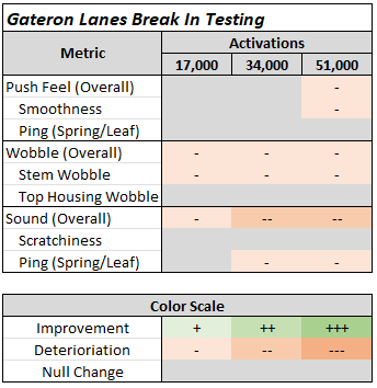 - No further increases in stem wobble were noted in this batch nor the one after it, making the Gateron Lanes fairly resilient to change on this metric over the course of the break in cycle.