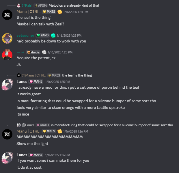 Only a few short weeks later on January 16th, 2025, Manu – who works for Delta Key Co – was talking in the general channel of Alexotos’ keyboard Discord about seeking out a new manufacturer to get some tactile switches made. Not just wanting any set of tactiles, though, Manu was on the hunt to find someone who could specifically make “[Zeal] Clickiez but cheaper and improved.” Serendipitously, Lanes was not only present in the channel at the same time that Manu was asking these questions, but freshly off of posting his updated idea on how to make just that sort of thing happen in Gateron Melodic switches. Expressing interest in the idea when Lanes had pointed out to Manu that he had already solved this very problem and would be willing to share his idea with him, Manu asked Lanes to ship his initial prototypes he had made to the more local Bowl Keyboards and then only minutes later stated that he’d begin reaching out to Gateron to potentially work on prototyping them into a real product if Bowl confirmed they were as good as Lanes had suggested. And the rest was effectively history from this point on. Following this public announcement of a project being formed, discussions quickly started behind the scenes with Manu, Bowl, and Lanes scrambling to generate ideas on how Gateron could effectively make a non-frankenswitched version of the poron gasket bound Melodics that Lanes had came up with. What came out through the next few weeks of brainstorming was a concept similar to that of Gateron Deeppings and would see a Melodic-style switch be made by Gateron with a hole cut out in the front of the bottom housings for a small plastic injection molded piece to be squeezed through the housings in front of the click leaves to act as a permanent pseudo-paper modded tactile switch. However, when Gateron quoted the efforts that would be required to make such a switch, they effectively simultaneously shot it down altogether in pointing out that not only multiple new molds would be made to make these switches, but that new machines to inject the injection molded ‘dampening pads’ at this angle would also have to be developed as well – something which was beyond too expensive for even the team of Manu, Bowl, and Lanes. (This ‘too expensive’ idea is elsewhere quoted by Kairi – another person who was present and active in Alexotos’ channel at the time of inception of the Lanes switches – as Lanes stating that Gateron would require an MOQ in excess of 200,000 switches in order to get the costing down to even $0.70 per switch.) After having slept on the rejection a bit, Lanes then came up with another way to much more easily and efficiently achieve the same result: rather than using injected squishy pads, instead have a small outcropping extend down from the top housings and ‘wedge’ itself behind the click leaves of Gateron Melodics instead. Not only did this idea make the production of Lanes switches much more feasible by dropping the R&D load down to developing only one new mold part with barely changed geometries, it also ultimately resulted in an MOQ and pricing from Gateron that the team found acceptable. In only a few short months since following trio luckily all collided with each other in the same part of the town square, they had an agreement with Gateron to start producing a tactile leaf based MX switch – the Gateron Lanes.