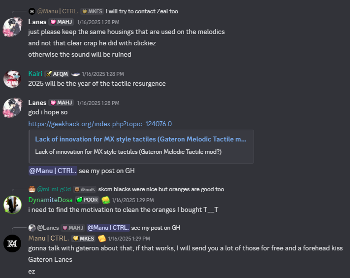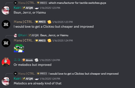 Figure 5: Hunt for “cheaper and improved” Clickiez switches begin by Manu in the Alexotos Discord server…