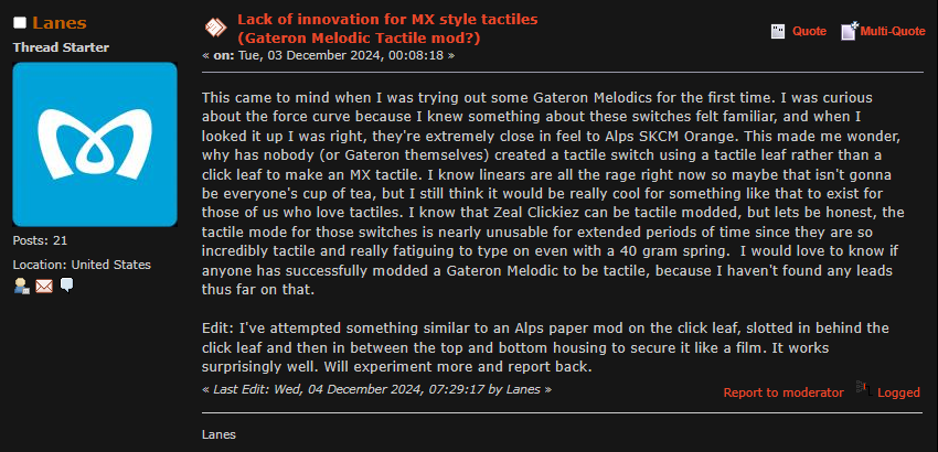 Not even a year ago on December 3rd, 2024, a fairly fresh Geekhack user by the name of Lanes posted a little read topic in the ‘Making Stuff Together’ section bemoaning a lack of recent innovation in MX-footprint tactile switches. Citing perceived similarities in feeling between the recent click leaf based Gateron Melodic switches and the feeling of original Alps SKCM Orange switches, this user pretty pointedly asked the question as to why almost nobody had yet made an MX-footprint switch with a “usable” tactile leaf. (“Usable” being a very key word here as Lanes had stated that the Zeal 3-in-1 Clickiez switches, which did have both a tactile mode and leaf-based mechanism in the MX footprint, were “nearly unusable for extended periods of time… and fatiguing to type on…”) While this question garnered only a couple of responses initially, it was clearly far from just an offhand, passing question that Lanes had tossed out there. Speaking with Lanes in preparation for this review, I was informed that this question was actually driven out of a very deep interest in and previous exploration of Alps SKCM Orange, Alps SKCM White, and SMK Gen 2 keyboard switches. After having built and used over a dozen different boards with these various switches in them in the time leading up to this question, he had been wondering throughout the months preceding his post if anything of the sort could truly exist in the MX footprint in a less aggressive fashion than Clickiez. While Gateron Melodics were impressive to him when they were first released a year prior in December of 2023, and enough so that he still claims to this day that they’re the best current clicky switch on the market as of the time of writing this review, they were ultimately clicky and not the tactile-only feeling and sound that he was seeking out. Sometime between December 3rd, when he first posted his question, and the tail end of holiday break on the 31st, Lanes was working on modifying and improving a pretty beat up set of Alps SKCM Orange switches when he recalled the existence of the ‘paper mod’ used throughout the years to touch up old Alps switches. This rather old modification, as demonstrated here in this partial video by Chyrosran, was done by sliding a semi-rigid piece of cardstock between the leaves and outer housings of Alps to help silence old tactile Alps leaves which had become inadvertently clicky over the years. After having complete it for the particular handful of switches which were treating him poorly at the time, it occurred to him that a similar thing could probably be done with Gateron Melodics as well. Not finding any initial success with the same paper cardstock that was working for his Alps switches, he eventually cut up pieces of poron switch pads that were lying around and jammed them into a similar location in the Melodics between the backside of the click leaf and the housing. Finding immediate success with this idea, he then posted an update to his original Geekhack thread. After showing off this invention in a step by step fashion that you’d imagine would be the start of the rest of this story in this background here. However, the current state of Geekhack in 2025 meant that this ride for the Lanes switches very nearly suffered a quick and early end right there in that very post.