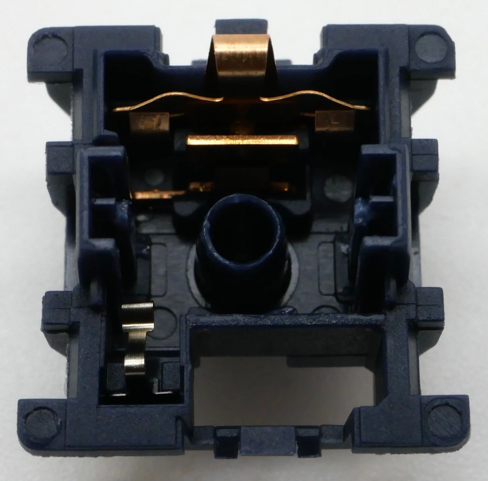 Finally arriving at the matte, deep navy blue bottom housings of the Gateron Lanes switches, it’s worth stressing that yet again these are identical to those of the Gateron Melodic housings in really every conceivable way. Internally these similarities include the presence of a strong south side spring collar, padded third-rail style guider rails, shiny mold ejection circles in the base of the housings as well as along the upper edge of the bottom housing, and of course the bent silver leaf mechanism used to produce the distinctive feeling (or sound) of these switches. As this leaf is identical in shape, placement, and angle as those of the Gateron Melodics it is again worth stressing that their differences in feeling and sound only come about as a result of the extended wedge tabs present in the top housings. In fact these similarities in both stems and housings are why the Lanes are also referred to as “semi-silent clickies” on some storefronts such as Bowl Keyboards despite being more readily thought of as tactiles. Externally the bottom housings also continue in similarities to the Melodics and many other modern Gateron switches with features including PCB mounting pins, a ‘GATERON’ anticounterfeit branding stamp between the metal PCB pins, a pair inverted capital letter mold markings between the PCB pins and the LED/diode through-housing slot, and of course an offset front attachment clip for the top housings to make space for the click leaf. There are also trace amounts of fine factory lubing located on the various parts of the bottom housings of the Lanes, though I feel it editorially responsible to note that these are interior parts only and not the exterior ones.