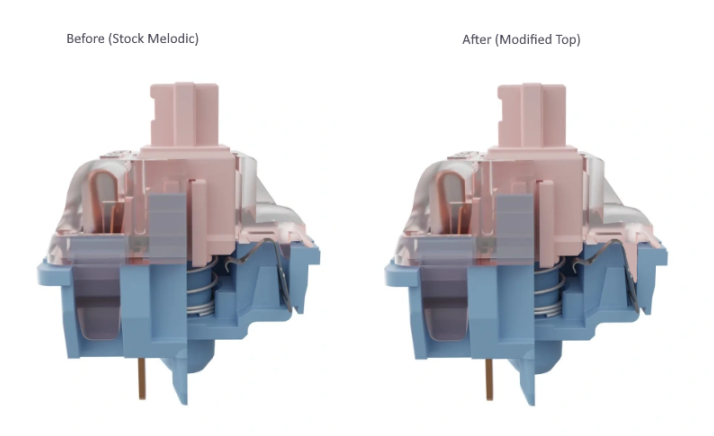 Figure 8: Product render showing the original Gateron Melodic housing design (Left) and the alternative idea that became Gateron Lanes concocted by Lanes to have the top housings wedge behind the click leaf to act like a paper mod (Right).