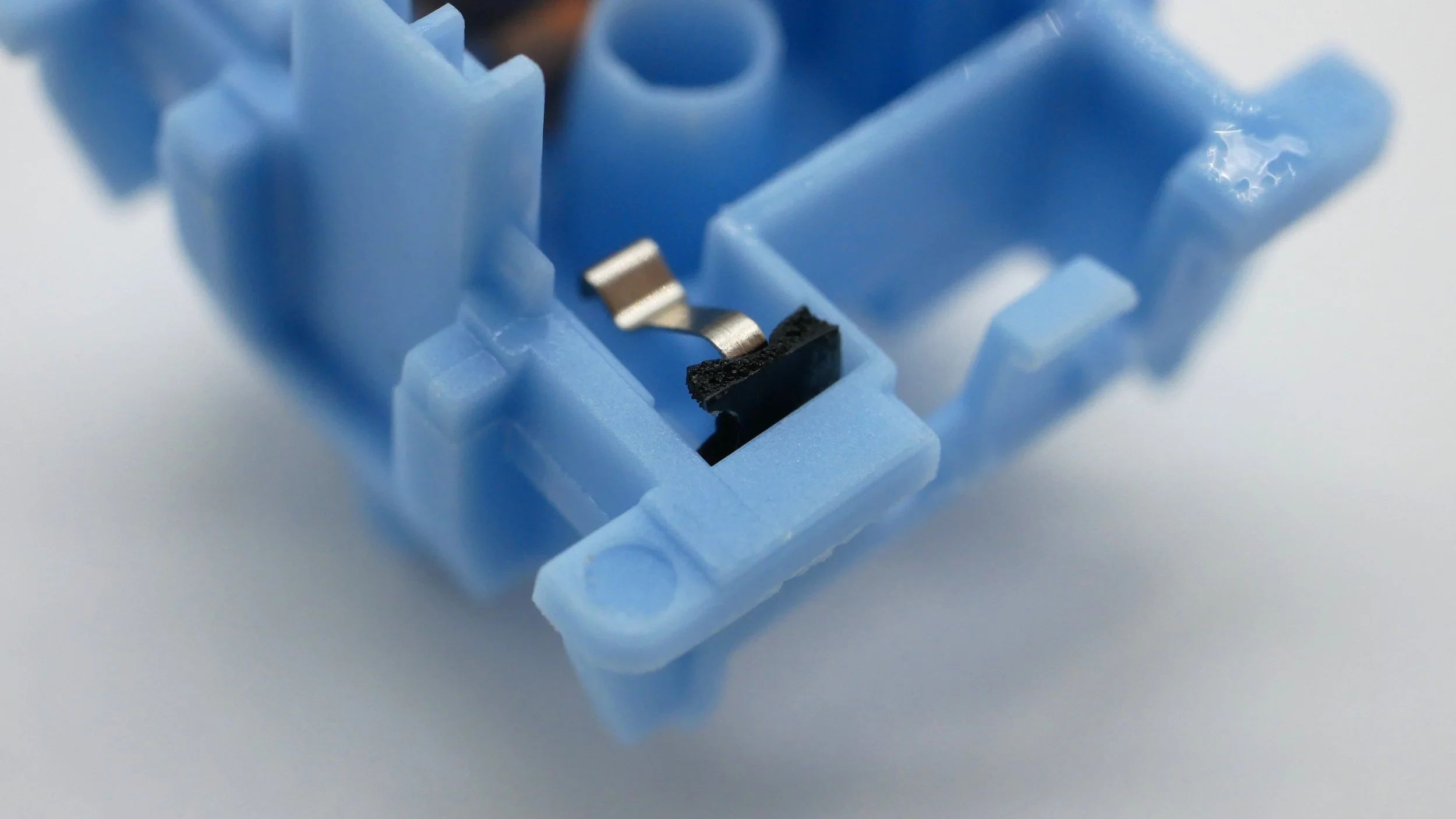 According to Lanes these very switches (and some of their historical shortcomings) were the direct inspiration behind the switches that have brought us all here today, so I felt it would be at least semi-worthwhile to actually visit them as a starting point to this section. With a wide, mid-stroke medium-light tactile bump, Alps SKCM Oranges are one of the two quintessential Alps tactiles that have not only made up a majority of people’s experiences with Alps over the years, but have also helped cement their popularity in the community even to this day multiple decades after Alps closed it’s doors. Sure, some could easily argue that the slightly heavier feeling SKCM Salmons are more “truly tactile” or that SKCM Ambers are more “authentically Alps” in feeling if they can afford to find them and afford to buy them, though the ubiquity of the Oranges mixed with their not overly harsh under-finger feedback is a big reason they are as popular as they are. However, like all good vintage switches most Alps do tend to degrade over time if not sealed in their original boxes forever. The SKCM series tactiles are prone to an especially annoying style of degradation in which they tend to become clicky over time, something which we’ve only very rarely seen in the MX footprint in switches such as the Kailh-made Box Novelias from 2018. The classic fix for tactile Alps switches which have become inadvertently clicky, as described above, was to slot a small piece of semi-rigid paper or cardstock between the leaves of the switches and their housings to dampen out this incidental clicking. (Also something that this very Alps switch that I measured ironically needs, itself.) Porting over this idea into Gateron Melodics, Lanes ended up cutting out poron switch pads to wedge into the tiny space between the housings and the click leaves to result in switches that ultimately looked like this.