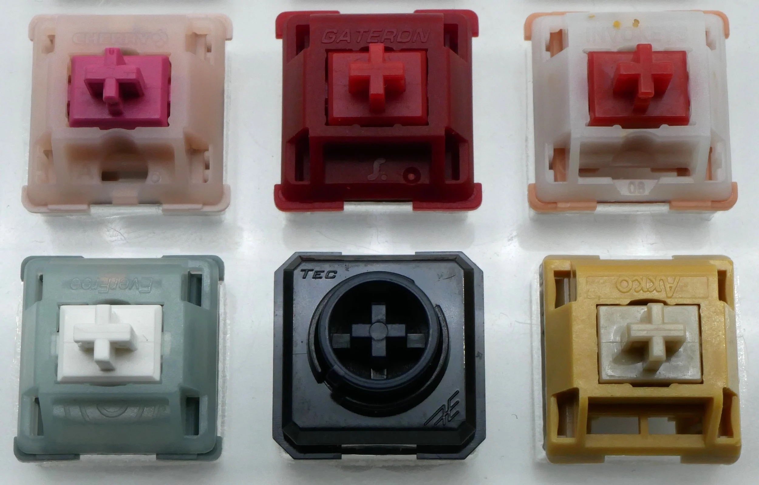 Figure 20: Switches for comparison. (L-R, Top-Bot: Cherry MX Petal, Sillyworks x Gateron Type R, Invokeys Goji Reserve, EverFree Grayish Tactile, AEBoards Naevy EC, and Akko Bittersweet)