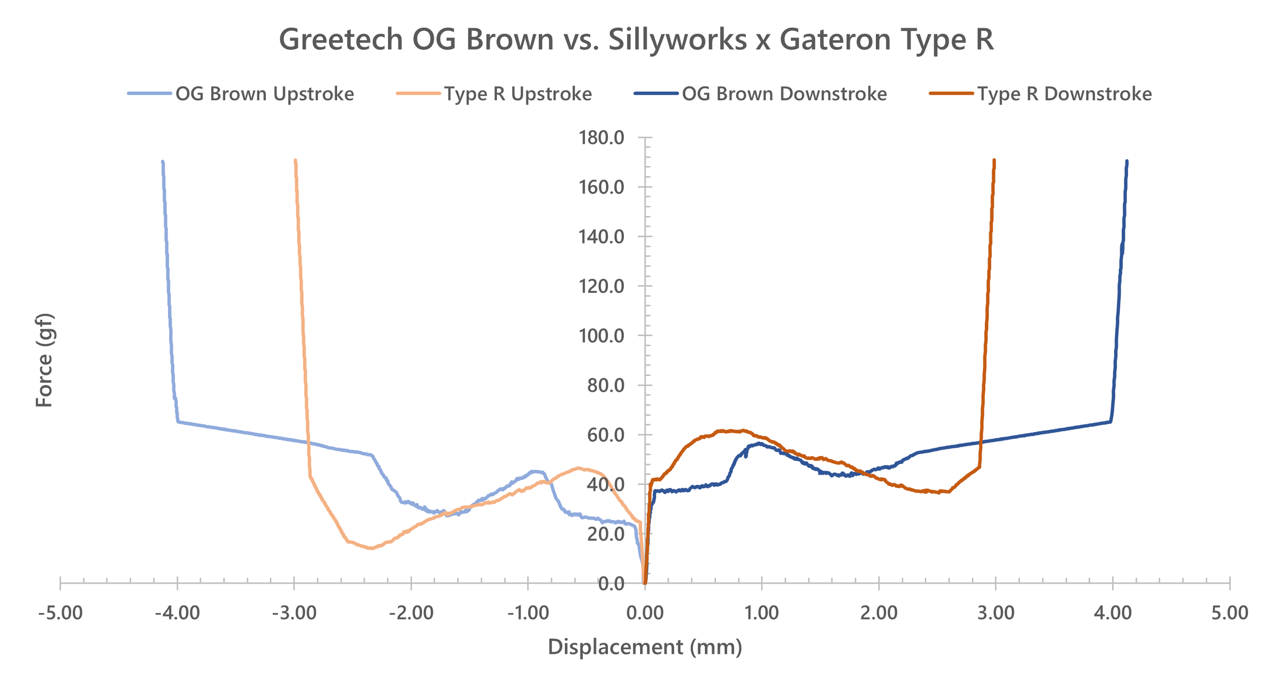 - Much like the note above in the Cherry MX Petal comparisons about differences in perceived peak tactile force as a result of sharpness of the tactile bump, the Sillyworks x Gateron Type R switches feel significantly heavier through their tactile peak than both the OG Browns and what the comparative force curve between them below would suggest.