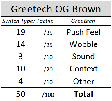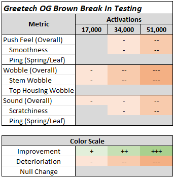 - After just 17,000 actuations, the Greetech OG Brown switches are already in for quite the slide in quality, having shown both noticeable increases in the stem wobble and inconsistency in sound of the switches throughout the batch. While the stock OG Browns were not overly consistent in their own right, the ones broken in to this point had more sporadic scratch sounds and inconsistent housing collision noises.