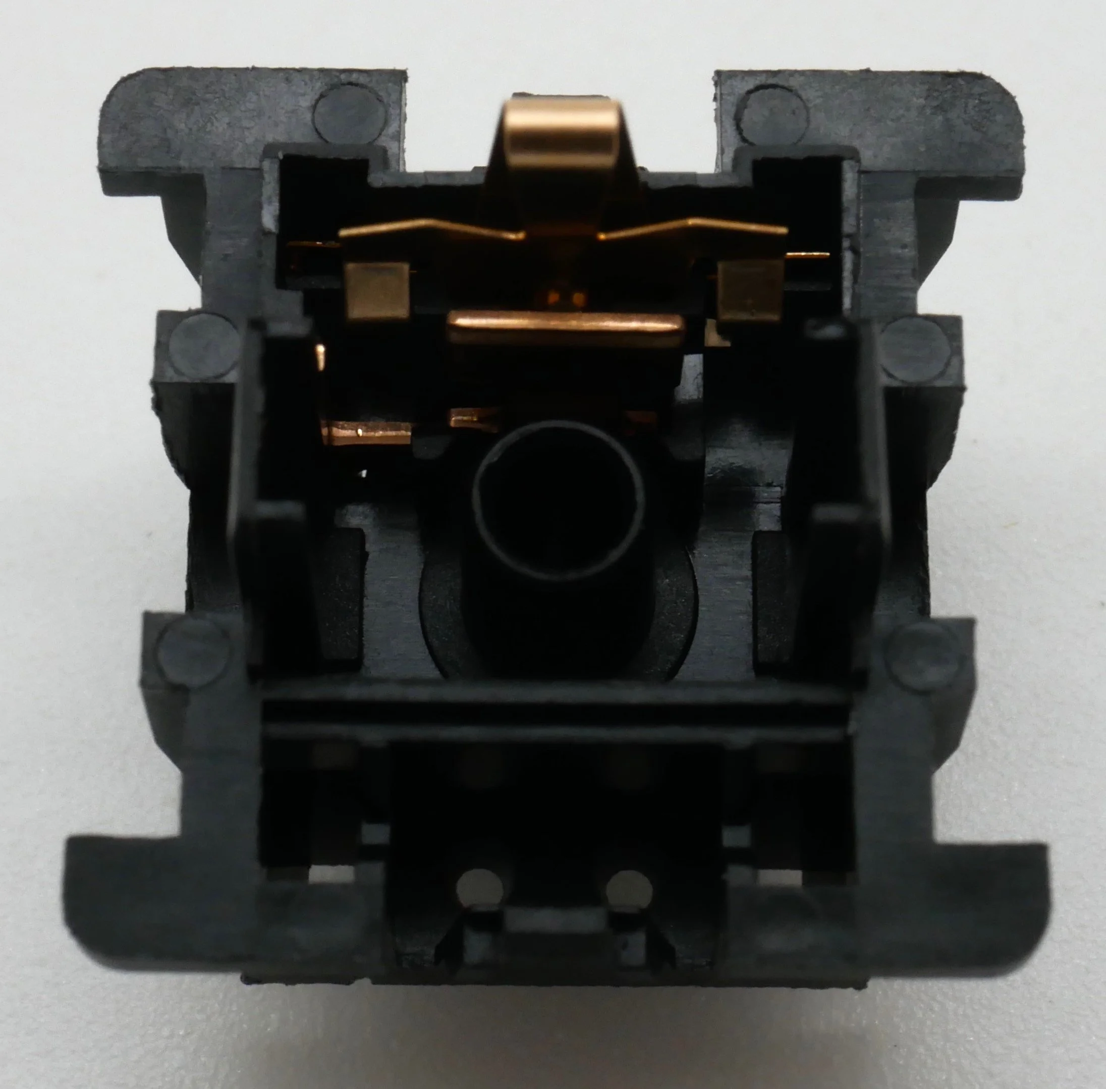 Finally arriving to the similarly full matte black, likely nylon bottom housings of the Greetech OG Brown switches, much like the top housings these too feature a similar overall shape and structure as classic OEM switches, though with small hints as to their modernity in the details. Internally, the housings are actually incredibly void of details, having no south side spring collar, no dampening pads of the base of the slider rails, no texturing on the slider rails whatsoever, and not even any mold features in the base of the housing. In keeping with historical convention as closely as possible, it doesn’t even seem that Greetech OG Browns were hardly lubed at all as not an ounce of factory lubing can be seen in the bottom housings at all – even on the stem leg/leaf interfaces where manufacturers traditionally glob on the lube. Externally these specific Greetech OG Brown switches come in 5-pin/PCB mount variety, though it should be noted that 3-pin variants were available for purchase as well. While the sideways ‘Greetech GT’ embossment between the metal PCB pins may initially strike many of you as being a surprisingly modern feature, this is actually not the detail that stands out as new, as Greetech switches going as far back as the ~2015 Greetech Razer switches featured this detail. Much like the top housings, its actually the subtlety of this embossment as well as the number-letter mold marking in the lower right-hand side of the housing that makes these less like conventional Greetech switches which were more aggressive and stand out in the text height of these features to my eye.
