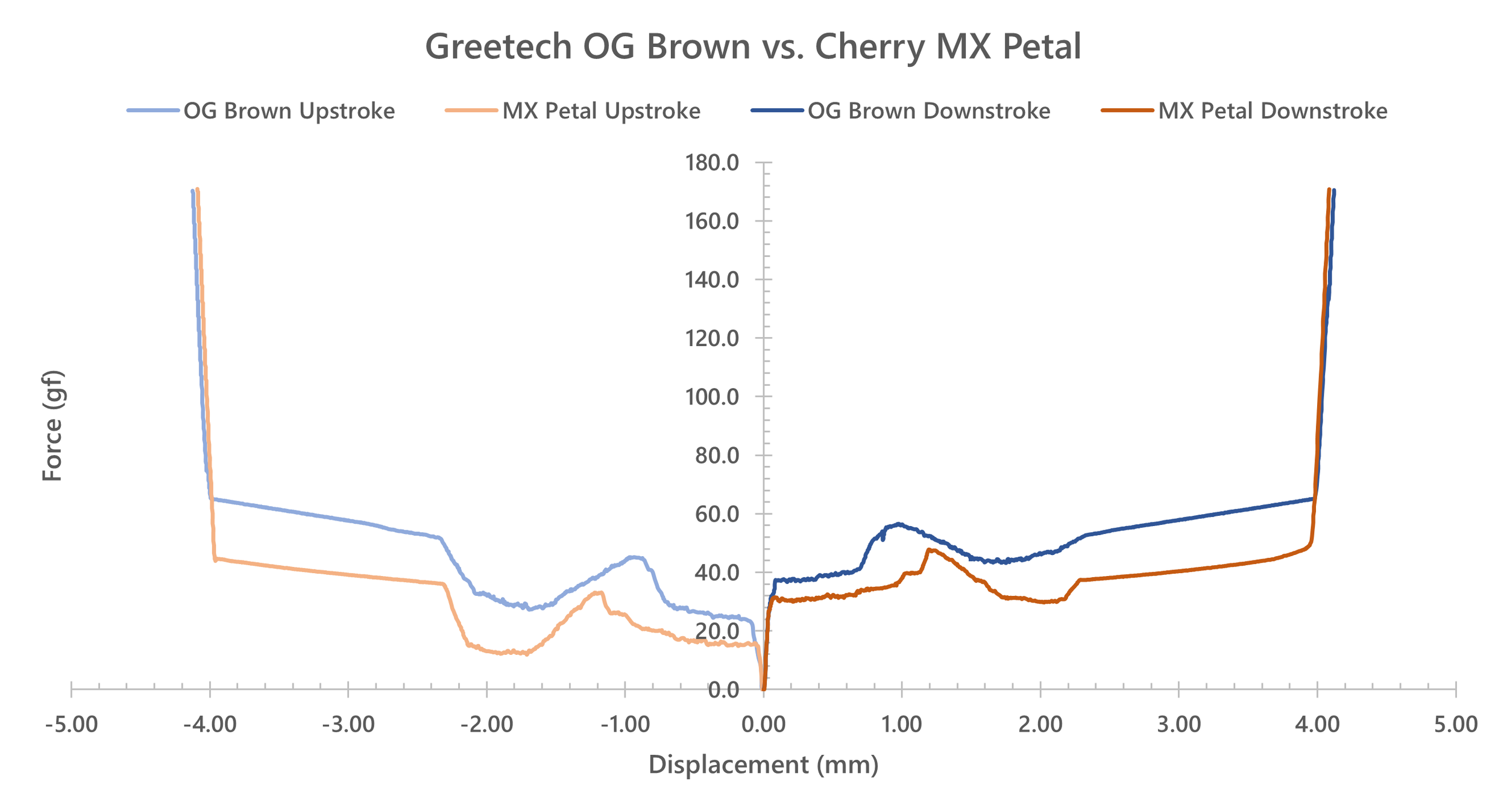 - In line with what the comparative force curve between these two switches below shows, the tactile bump of the MX Petals is a bit sharper, snappier, and carries a tiny bit more of a bite to it than the slower, more rolling tactility of the Greetech OG Browns. The difference in directness of this tactile bump, as well, does also make them feel more similar in weight at peak force than what the actual difference measures out to be.
