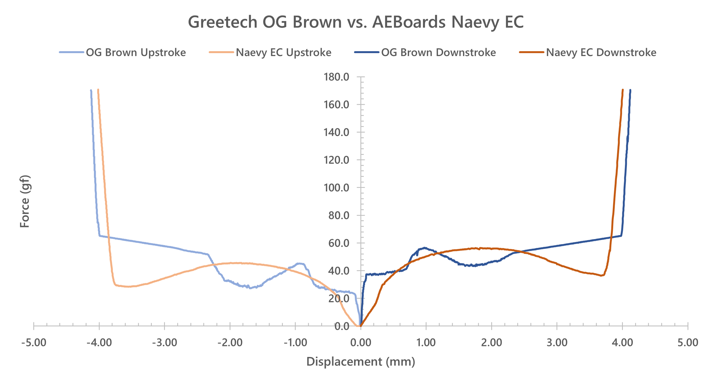 - Despite what the comparative force curve between these two switches below would suggest, the Greetech OG Browns surprisingly feel snappier and more strong through their tactile bump than the Akko Bittersweets. My best guess is that this is due mainly to the differences in height from their respective linear pre-travel regions to their peak tactile force between the two switches, something which is larger in the OG Browns.