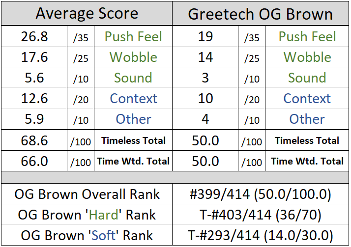 Painfully scratchy, inconsistently pingy, sometimes snappy through the bump, and variable housing collisions are all ways to describe the Greetech OG Browns. Really the only redeeming portion of their sound profiles are their deeper, solid housing collisions but even these feel cheapened and less enveloping than the classic Cherry-style nylon housings that they are clearly attempting to emulate.
