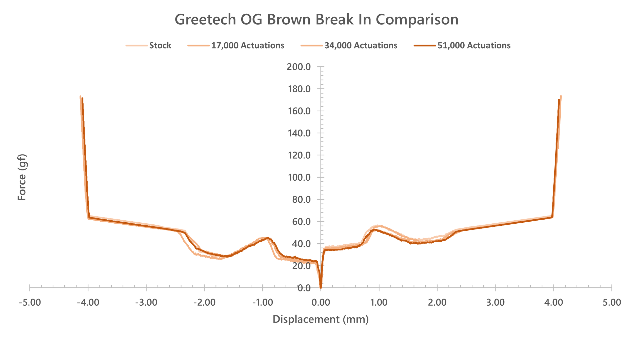 Figure 19: Comparative force curve diagram showing no substantial, consistent change in the force curves of the Greetech OG Brown switches throughout the break in process.