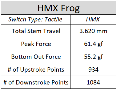 Starting at the very top of the downstroke with a medium-strong, ~62 gf tactile peak, the HMX Frogs very quickly unfurl throughout their shortened travel distance to land into a pointed and somewhat rounded stem pole bottom out that gives these switches a one-two punch combo of hits. While the factory lubing in the HMX Frogs does a solid job of keeping the switches scratch free across the board, some inconsistencies present do make the tactile stem leg/leaf interfaces in some switches feeling more textured than others at times.