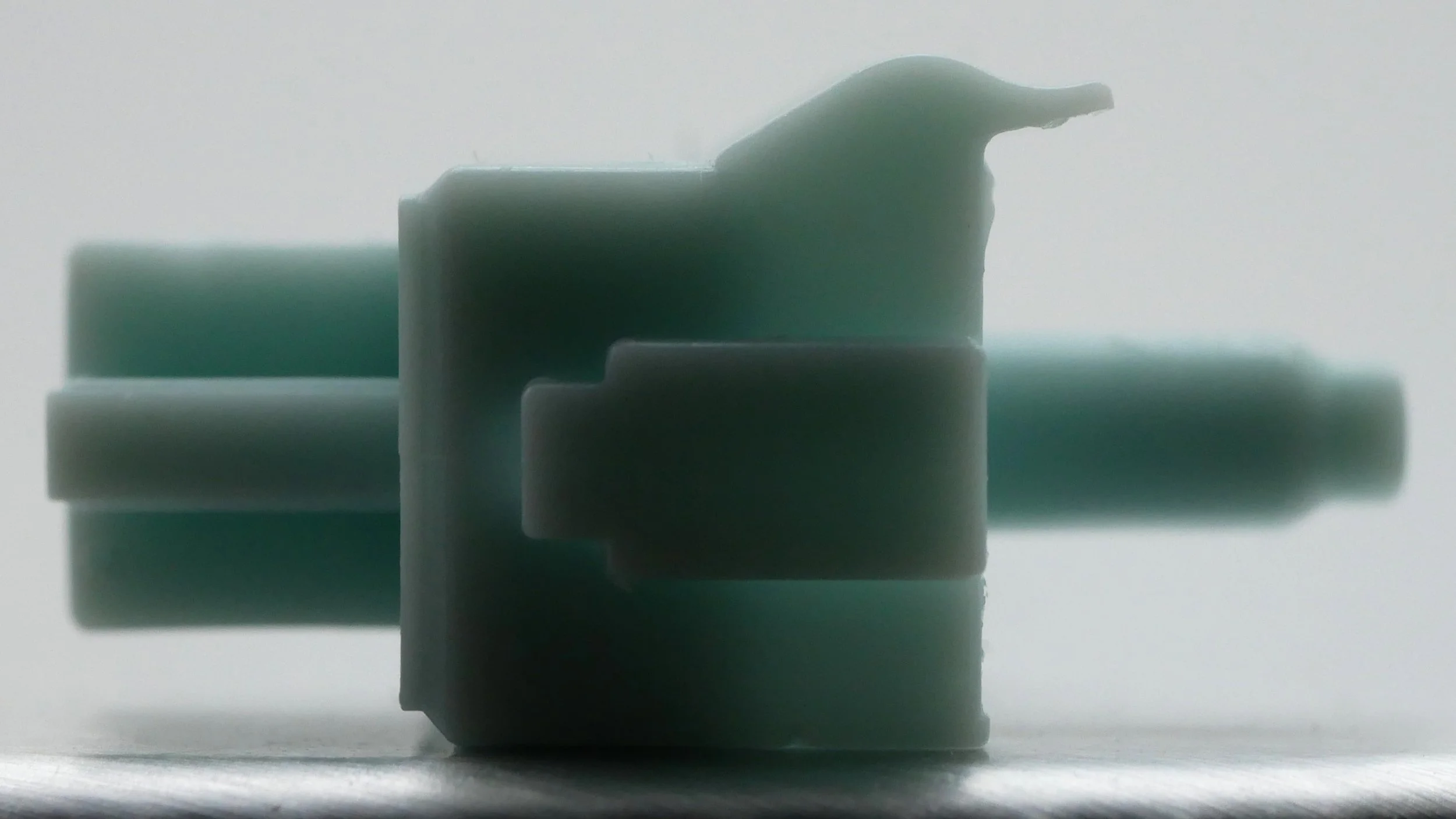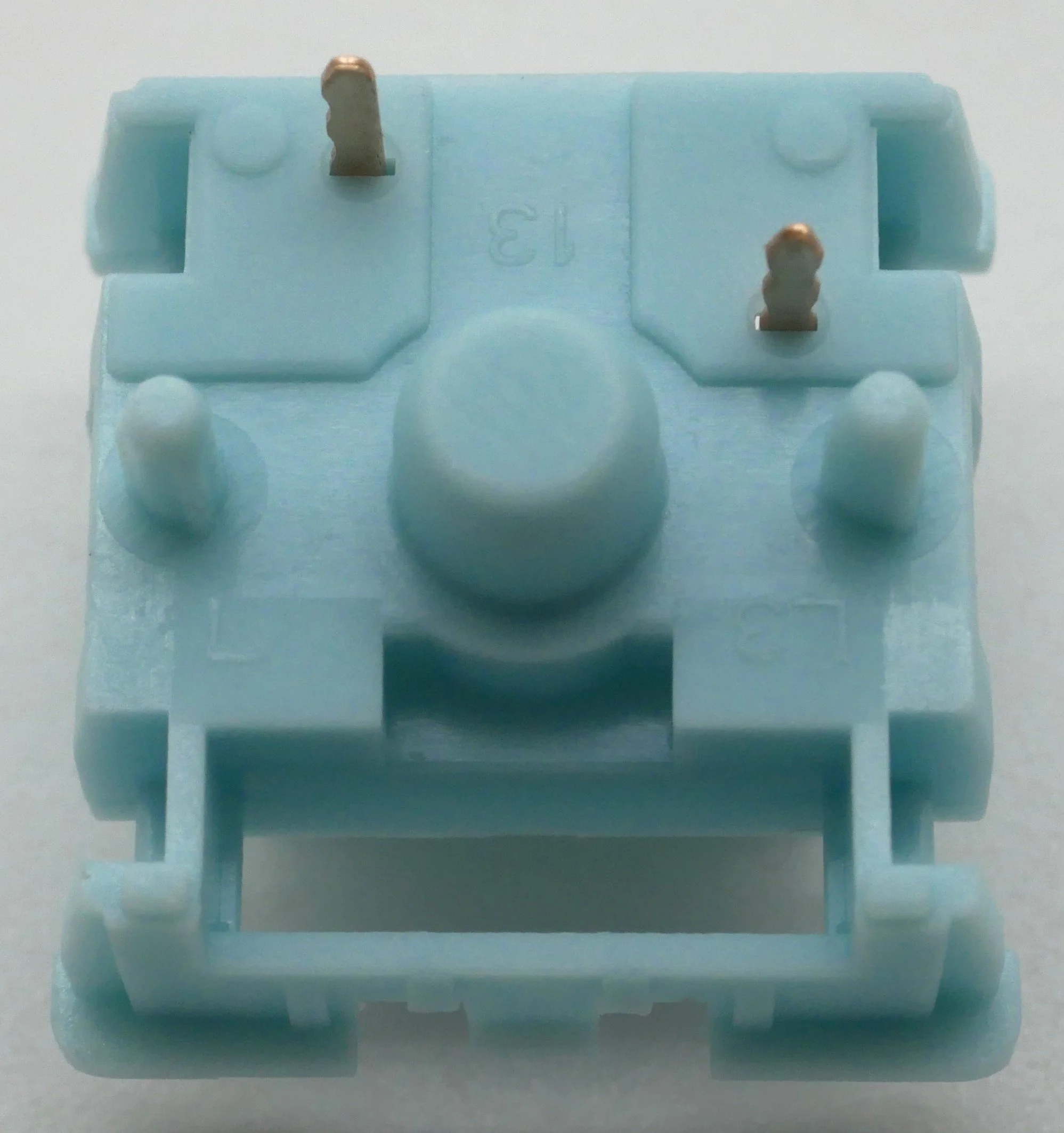 Moving next to the pale, baby blue stems of the HMX Frog switches, we encounter a handful of details that are neither unexpected nor necessarily unique among HMX nor HMX tactile switches released previously. With a ‘high and tight’ style stem that features a pronounced center pole length relative to shortened slider rails, it’s evident that this stem is meant to ground out into the bottom housings sooner than a conventional 4.00 mm travel distance – something also made clear by the 13.46 mm total stem length and even more so evident by the 3.620 mm stem travel distance seen in the force curves of the Frogs in later sections of this review. Beyond these features, the HMX Frog stems are fairly traditional, packing squared off slider rails, mold ejector circles on the front plate of the stems, and trace amounts of evenly dispersed factory lubing across all sides of the stems.