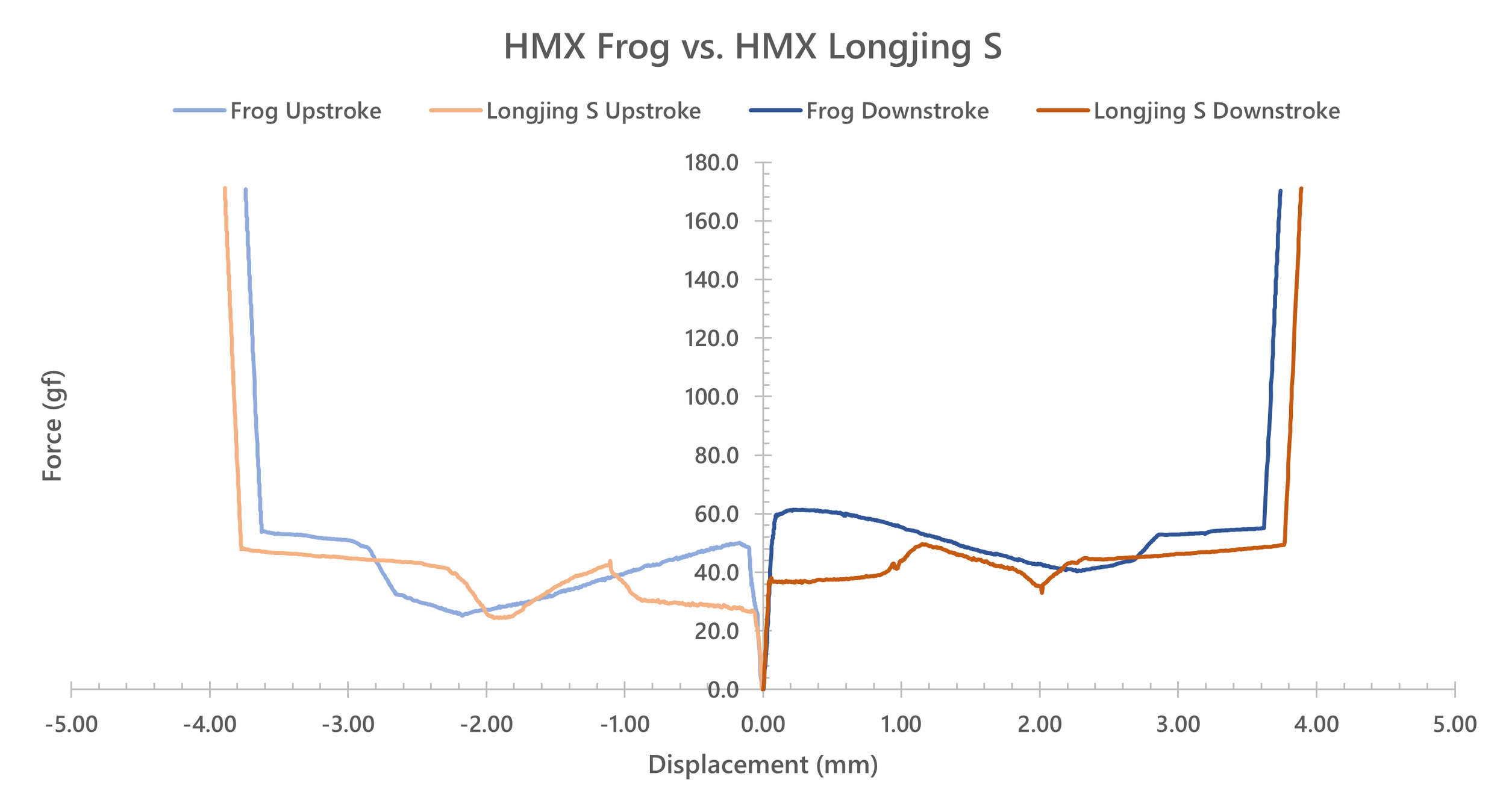 - Likely as a result of the lighter spring weight used in the HMX Longjing S switches not being able to as firmly hold the stems into the top housings when at rest, the Longjing S switches have slightly more stem wobble in both N/S and E/W directions than the HMX Frog switches.