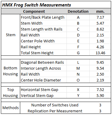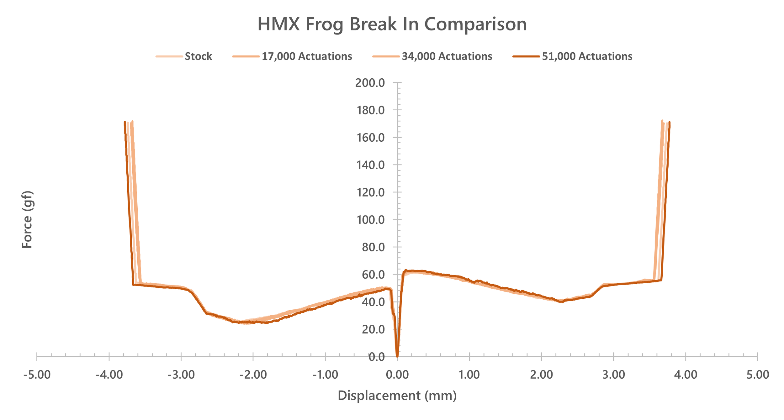 - Even after only 17,000 actuations, the HMX Frog switches begin to noticeably change as a presumed result of factory lube migration. This is most apparent in this batch of switches through their sounds as more and more switches begin to pick up stem leg/leaf ping that is apparent every time the switch is actuated.