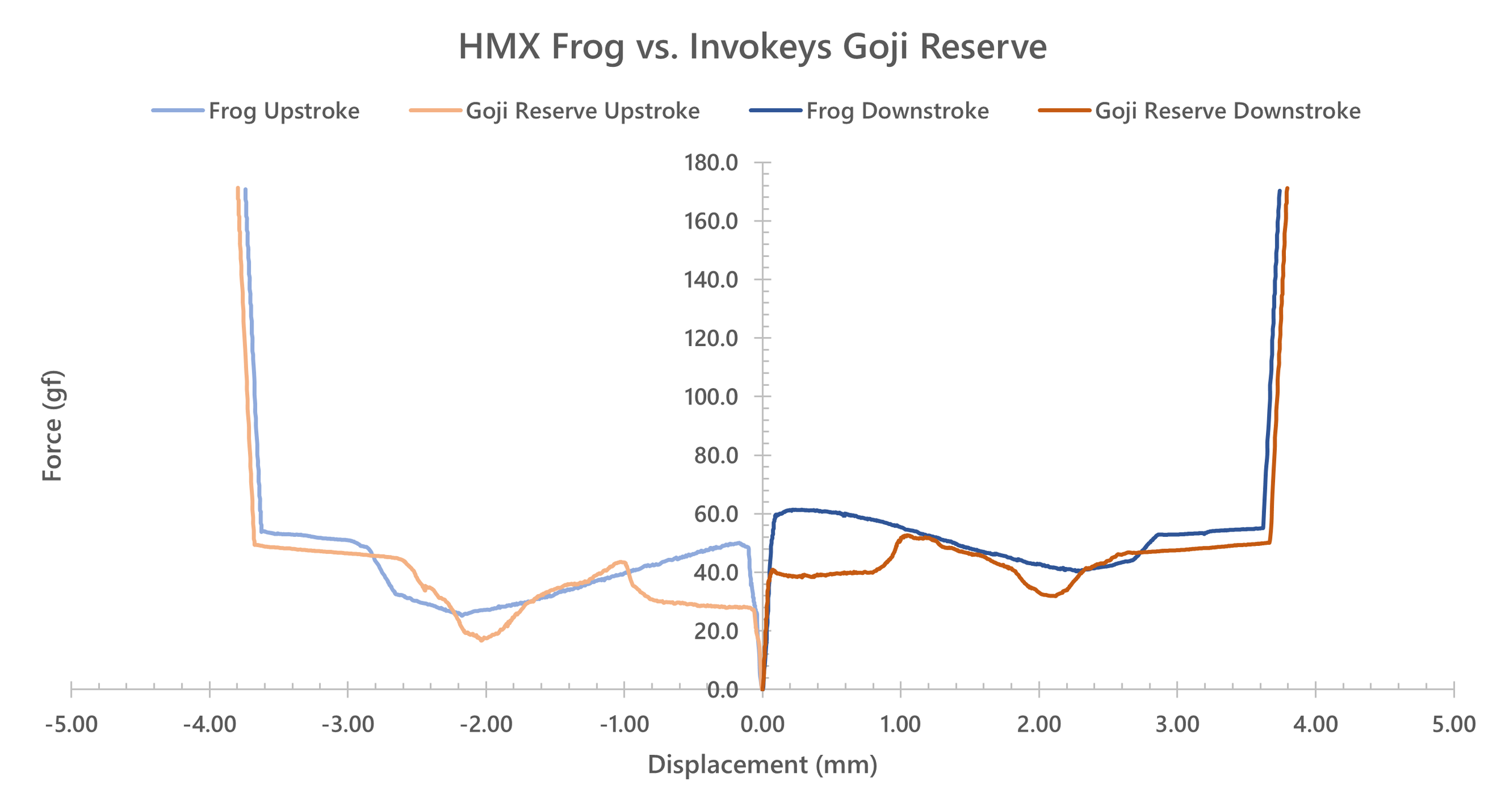- While the Invokeys Goji Reserve’s bottom outs are ever so slightly more muted and less sharp than the HMX Frog switches, surprisingly the bottom outs of the Goji Reserves feel the most similar to the Frogs of any of the switches on this comparison list.