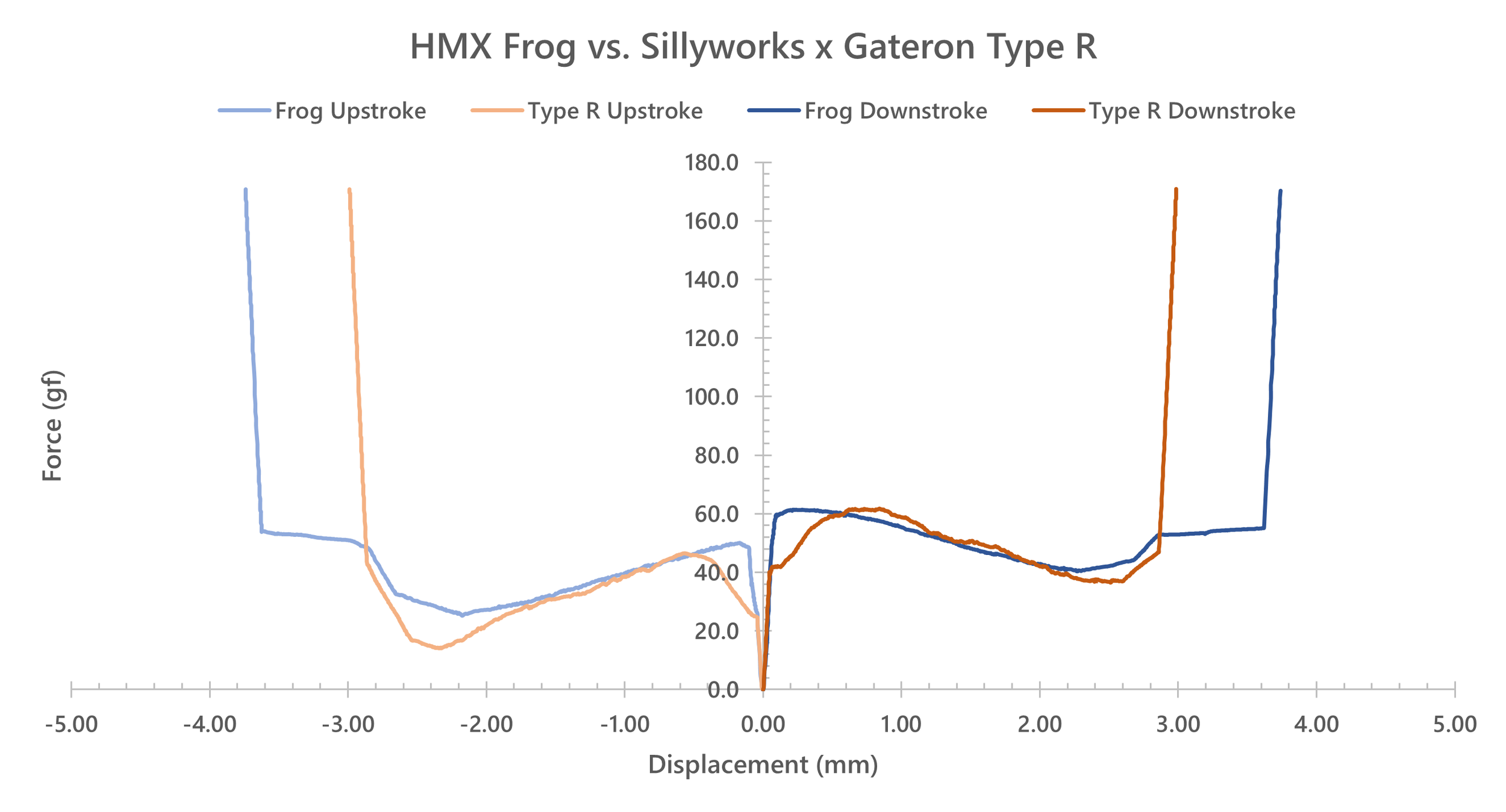 - While these two switches are comparable insofar that they both have tactile bumps that punch towards the top end of their downstrokes, the fact that the Type R’s bump ramps up to its peak as can be seen in the comparative force curve below makes them feel slightly more hefty and punchy than the HMX Frogs despite having relatively similar peak tactile forces.