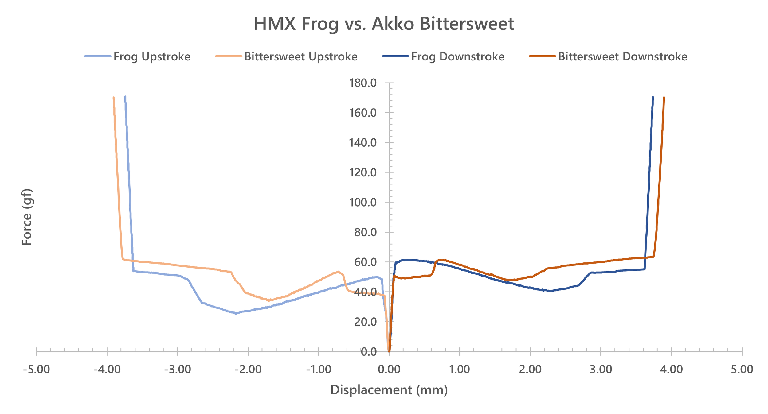 - Much like with the Type R comparison above, while the Akko Bittersweet and HMX Frog switches have very similar overall peak tactile strength as one another, the differences in how they get to that peak tactile strength makes them feel substantially different. The Frogs just feel wider, larger, and more overwhelming than the comparatively smaller, softer tactility of the Bittersweets.