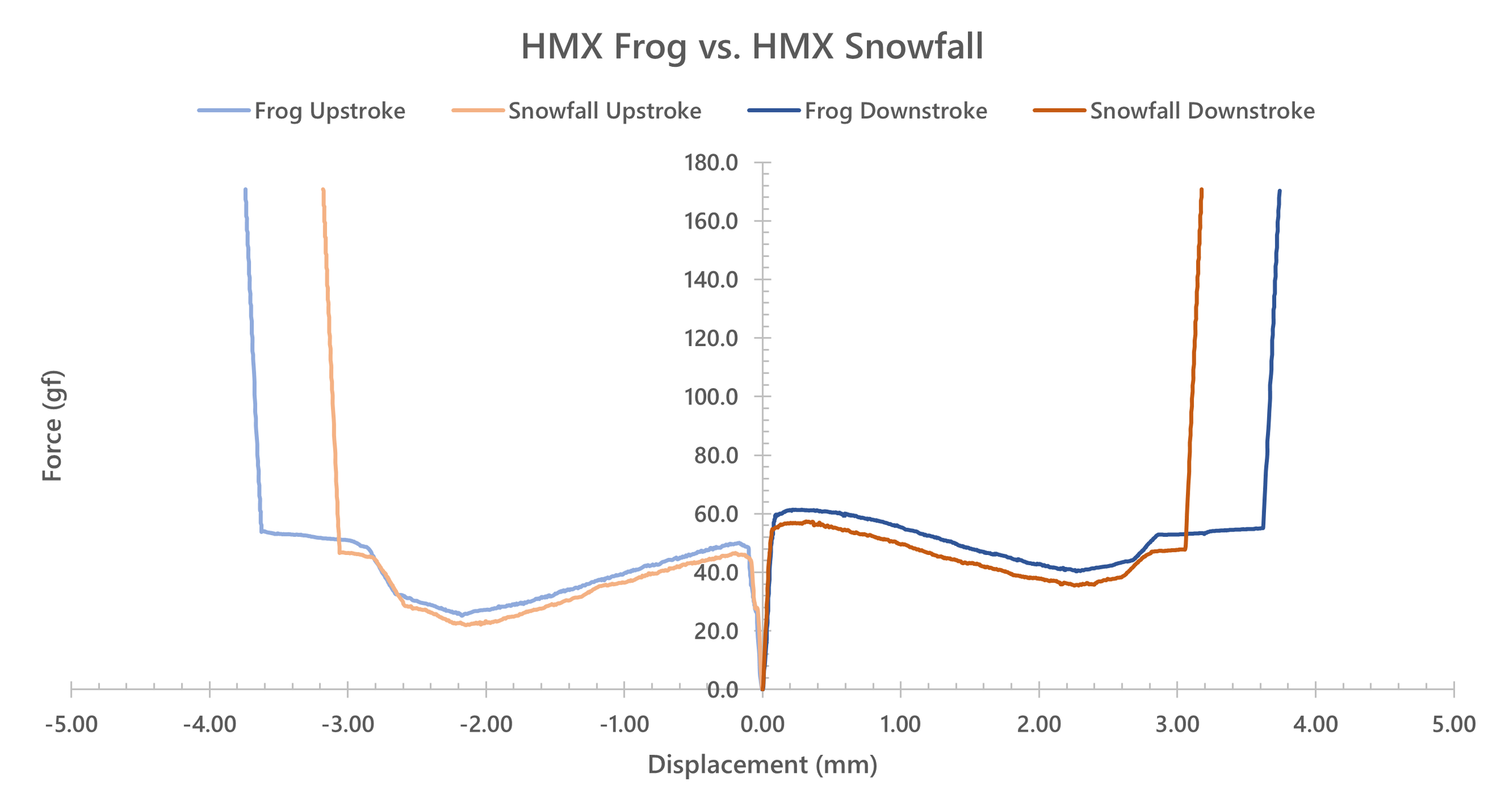 - Despite having extremely similar tactility and overall strokes as one another, the HMX Snowfalls are quite noticeably sharper and more pointed at their bottom out than the Frogs which gives them more of a ‘bottom heavy’ feeling to their overall presence than the Frogs.