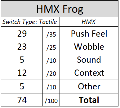 - In terms of push feeling, these two tactiles are extremely diametrically opposed, with the MX Petals having a quick, centered-in-downstroke ‘blip’ of a tactile bump whereas the HMX Frogs have a larger, more winding, and overall stronger tactile bump that punches right out of the gate. Even the bottom outs are different here, with the shortened stem travel of the HMX Frogs giving them a punchier, more firm feeling than softer, more dampened bottom outs of the MX Petals.