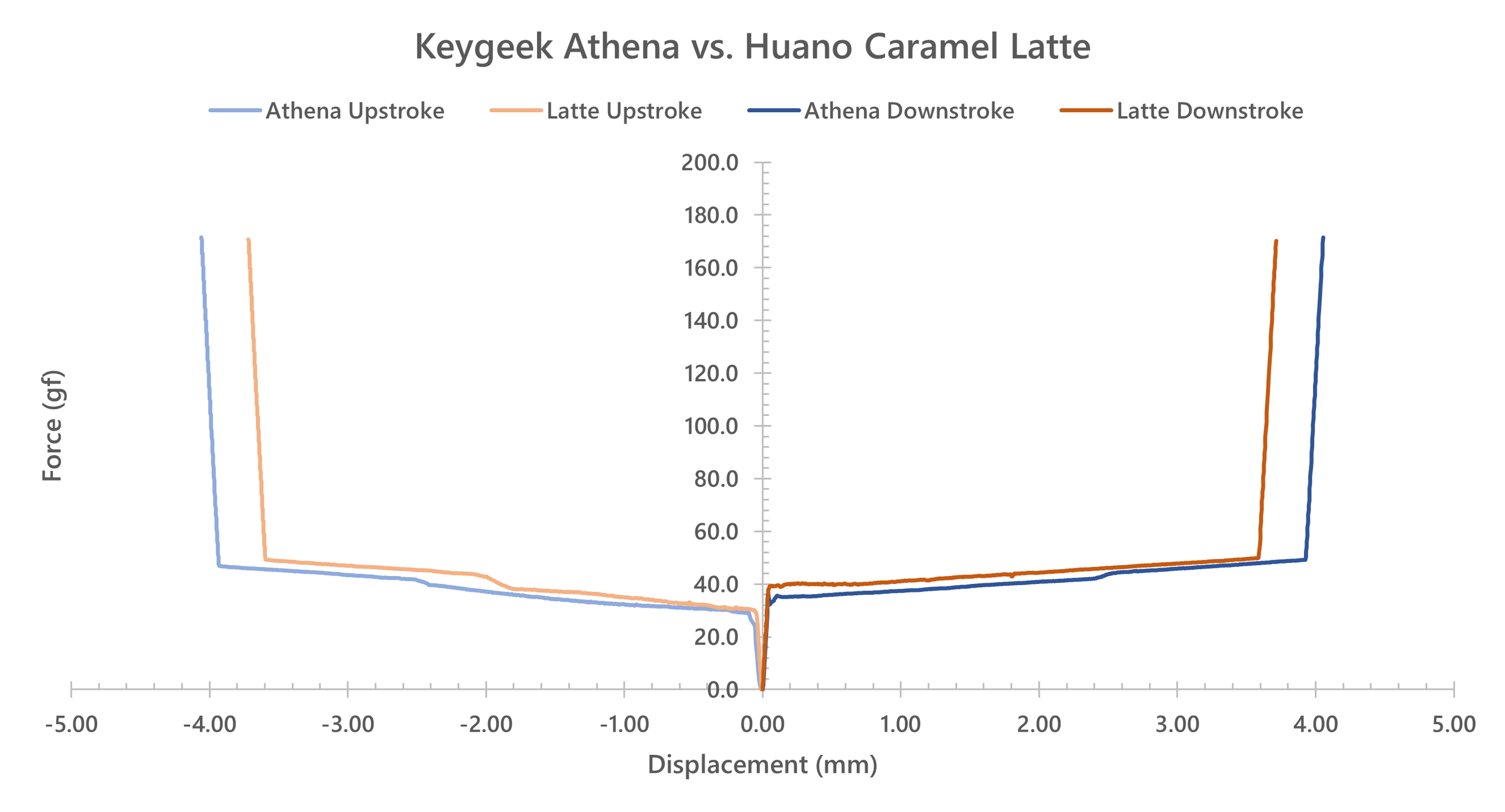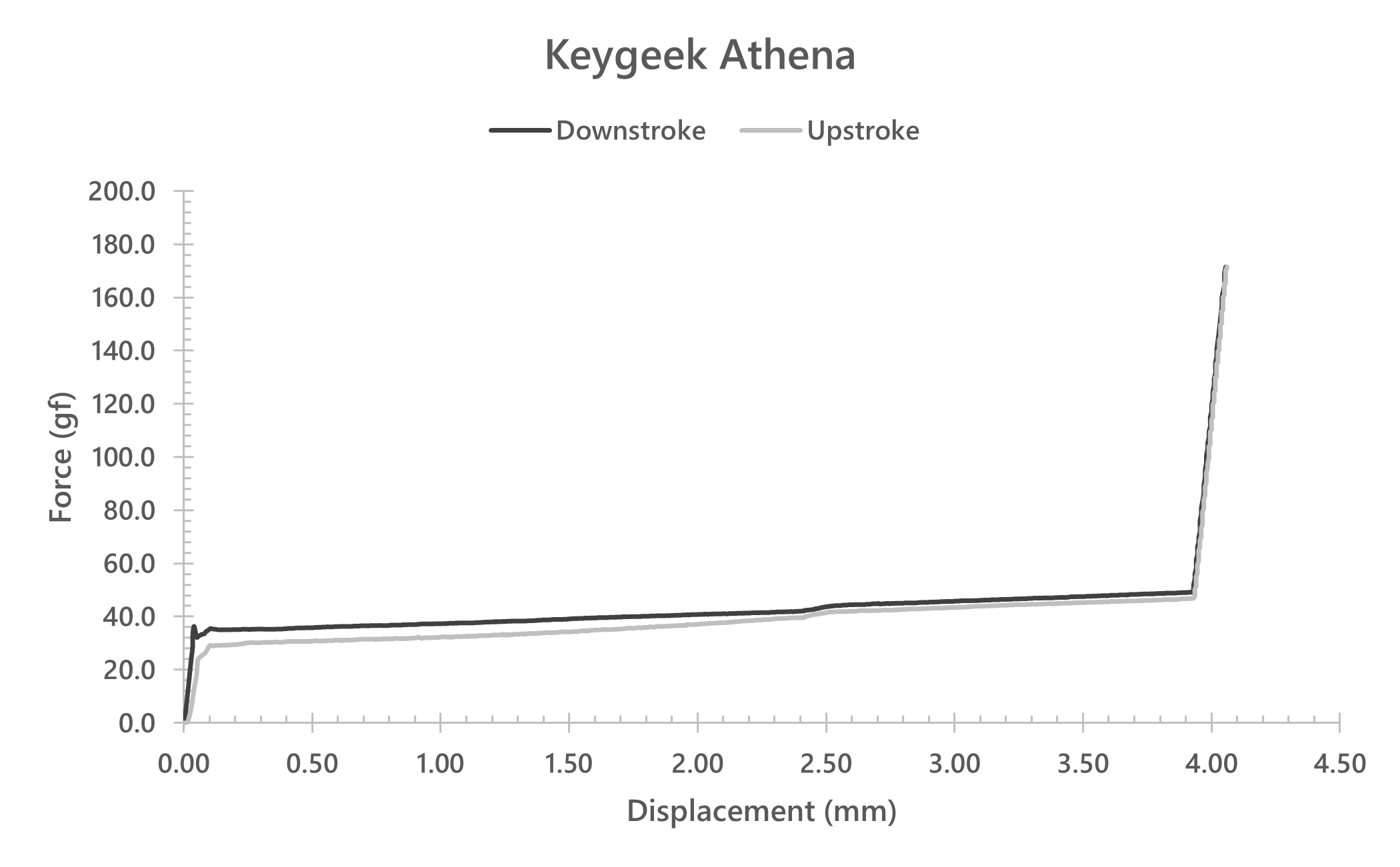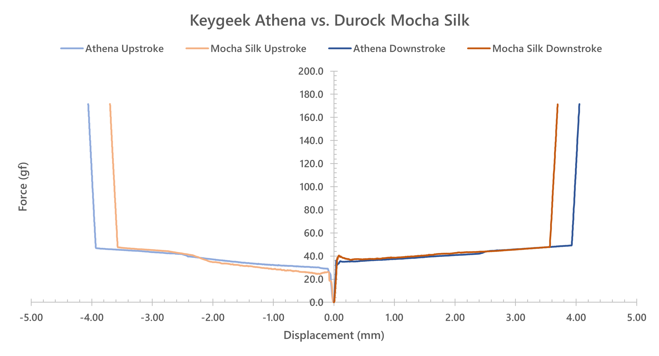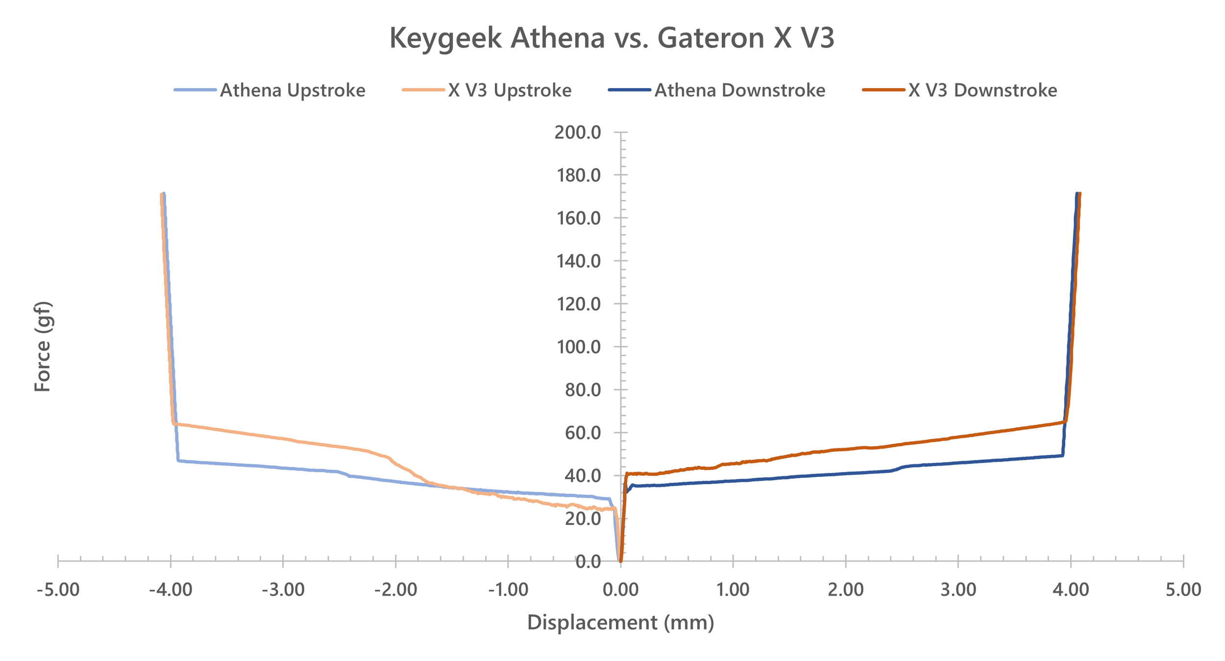 - While I believe the comparative force curve between these two switches is fairly accurate, I want to highlight the left-hand side of the plot in the upstroke region for once as I feel like the difference in the curves actually shows up in hand. Despite being similarly weighted once the PCB leaves re-engage, that strong downward arc in that curve of the MX Oranges really makes them feel much more ‘springy’ or ‘snappy’ in their upstroke return than the Keygeek Athenas.
