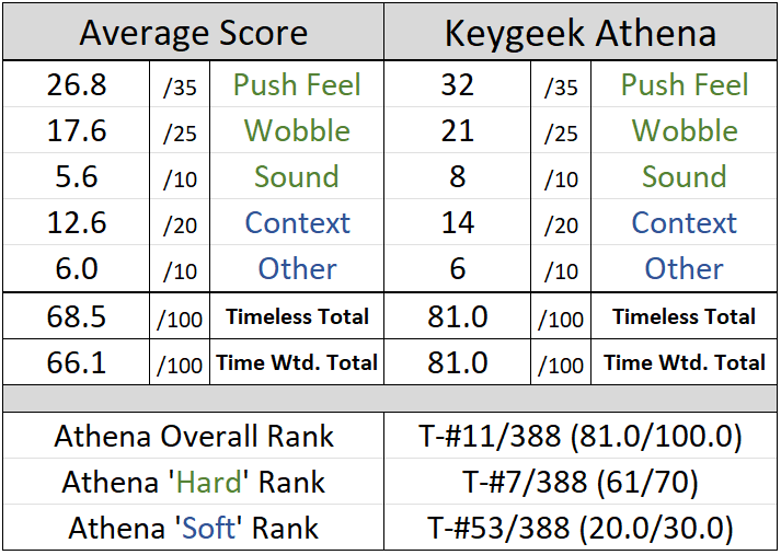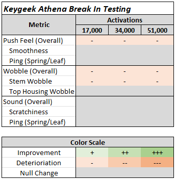 - After 17,000 actuations, the Keygeek Athena switches did not appear to really change all that much compared to their initial, right out of the box form. The only minor differences that I could notice were slight increases in the variety of tones and feelings at bottom out across the batch of switches, though this still is quite small relative to what I’ve seen with other switches before.
