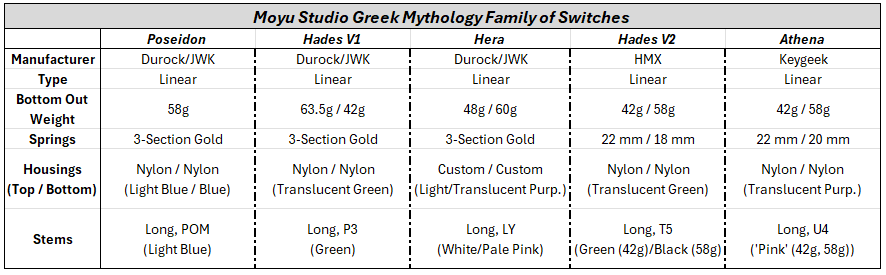 Figure 4: A table of specifications for each of the Moyu Studio Greek Mythology family of switches gathered from their respective Geekhack Interest Check pages.