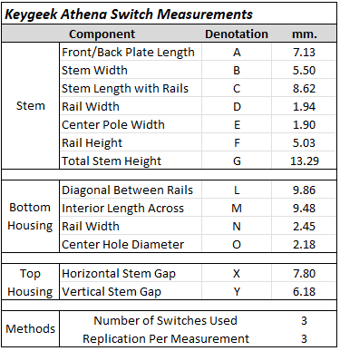 If you’re into this level of detail about your switches, you should know that I have a switch measurement sheet that logs all of this data, as well as many other cool features which can be found under the ‘Archive’ tab at the top of this page or by clicking on the card above. Known as the ‘Measurement Sheet’, this sheet typically gets updated weekly and aims to take physical measurements of various switch components to compare mold designs on a brand-by-brand basis as well as provide a rough frankenswitching estimation sheet for combining various stems and top housings.