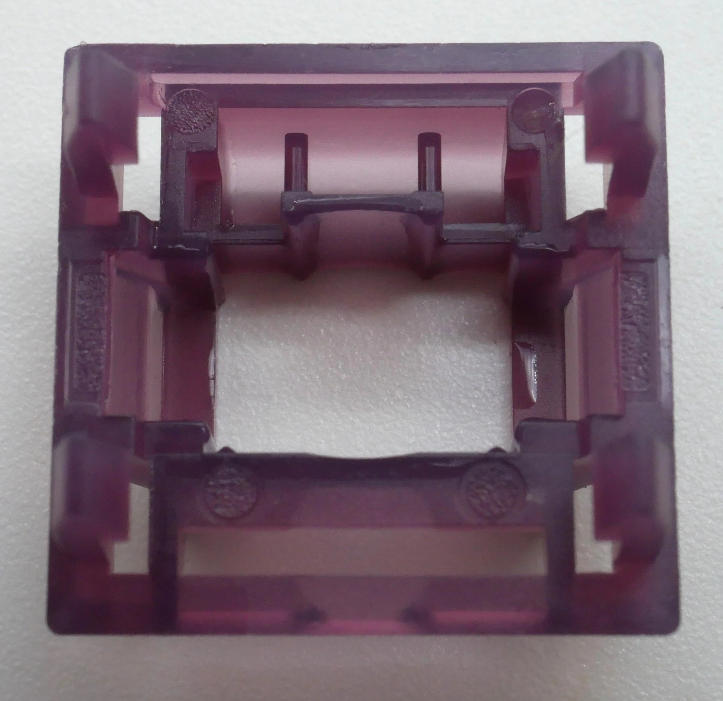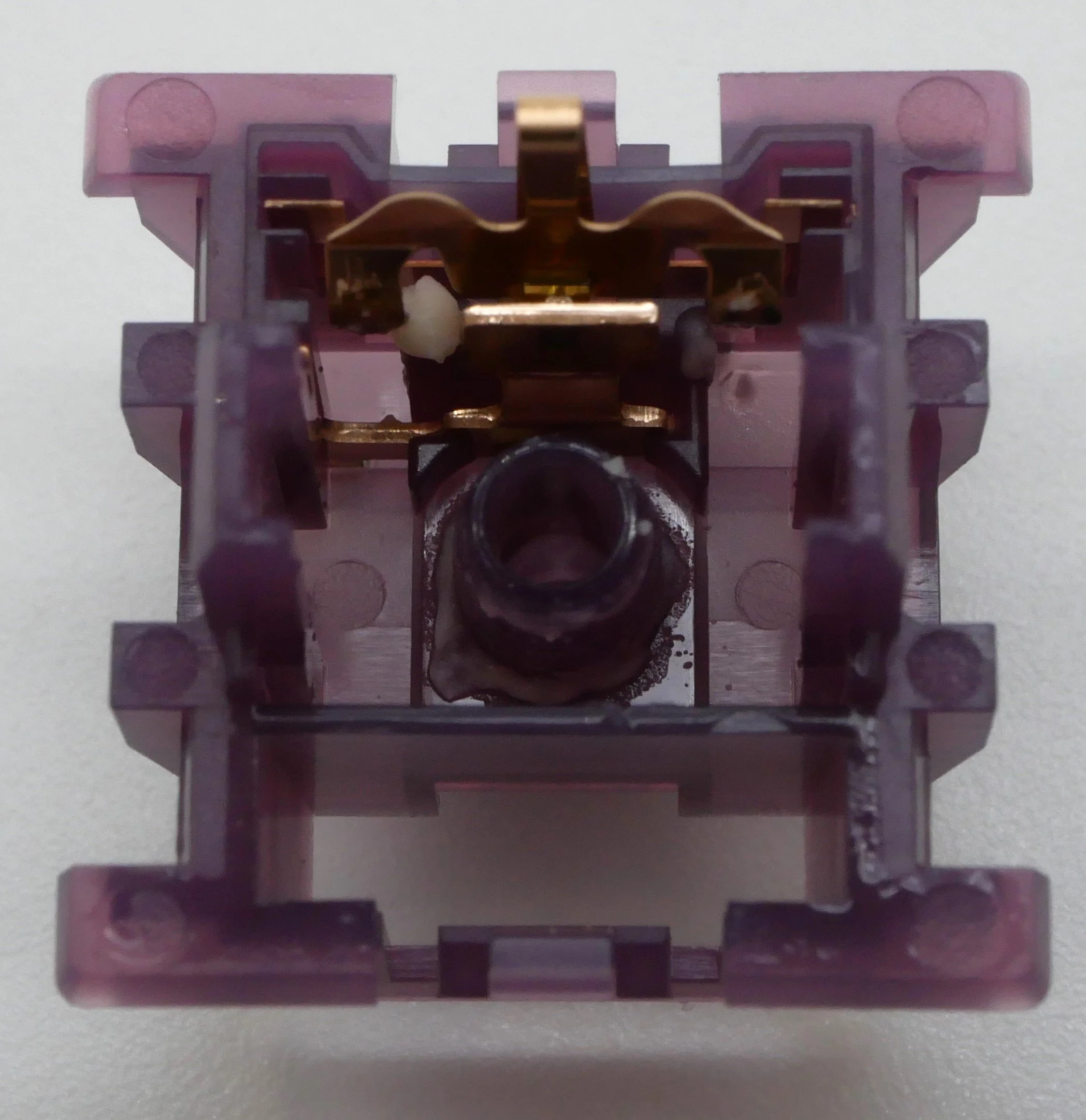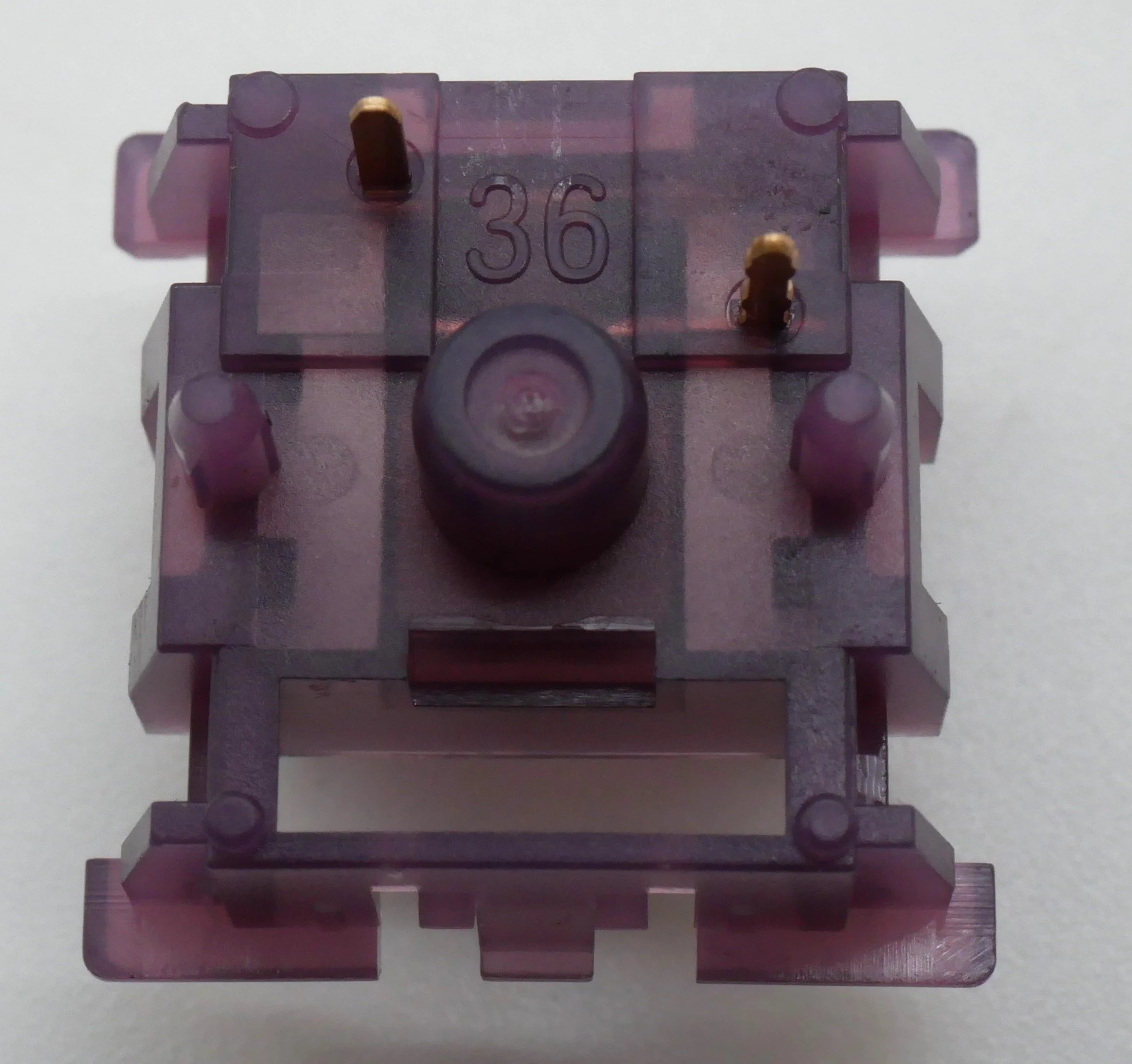 The translucent, matte royal purple nylon top housings of the Keygeek Athena switches well match up with the design details and specs that Keygeek has touted in their other switches throughout their short rise up the switch manufacturer totem pole. While they haven’t been around nearly as long as some more established factories that have been forced into redesigns over time, Keygeek’s steadfast dedication to specific identifiable design details like their small, blank rectangular nameplate “logo”, their long thin LED/diode slot with centered circular indentation and numerical mold marking, and internal matte ejector circles on the interior of the housing is quite impressive. All of these details were seen identically in the top housings of the Keygeek Oat switches in their full length review, even down to a very similar sort of opacity in the housing color as well. Unlike the Keygeek Oat switches, though, the presence of trace amounts of factory lube is more obvious in the Keygeek Athenas due to the contrast between the purple color and that of the milky white colored factory lubing. Overall, though, the majority of the lube is concentrated in the base of the bottom housings of these switches as can be seen in the photos further down in this section.