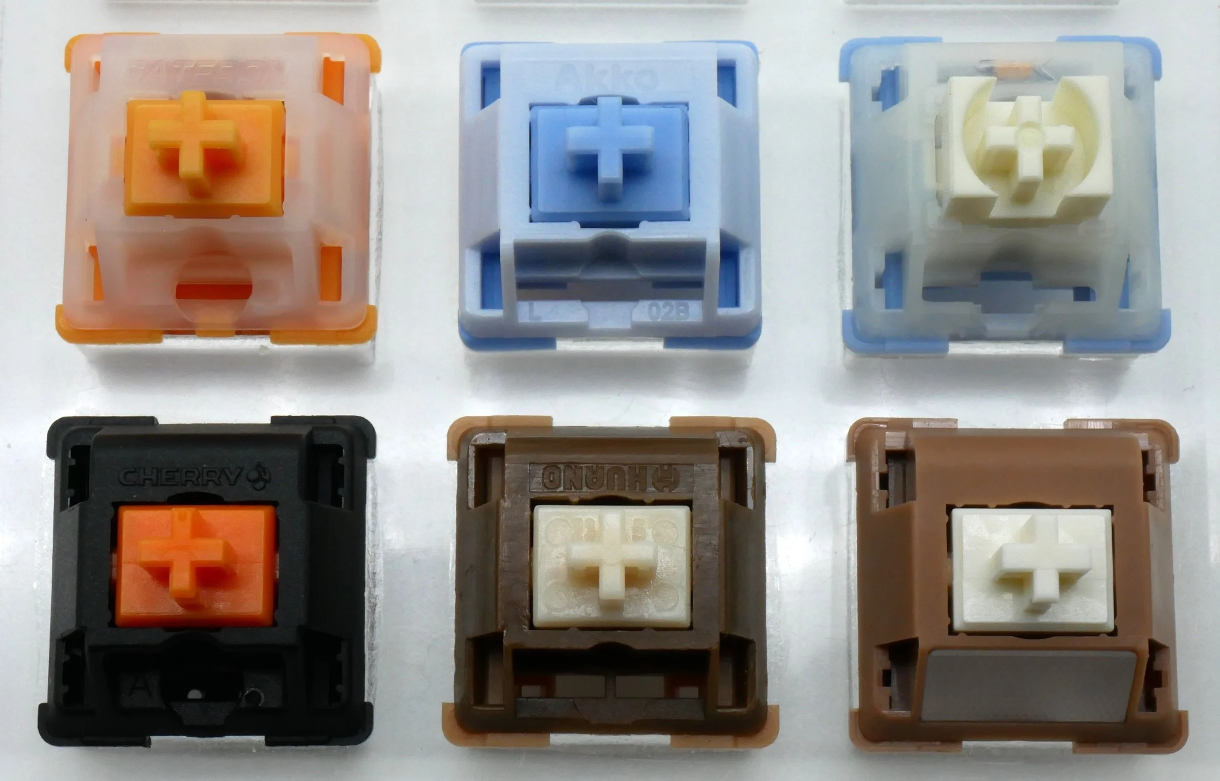 Figure 16: Switches for comparison. (L-R, Top-Bot: Gateron X V3, Akko Mirror, SWK Ripple, Cherry MX Orange, Huano Caramel Latte, and Durock Silk Mocha)