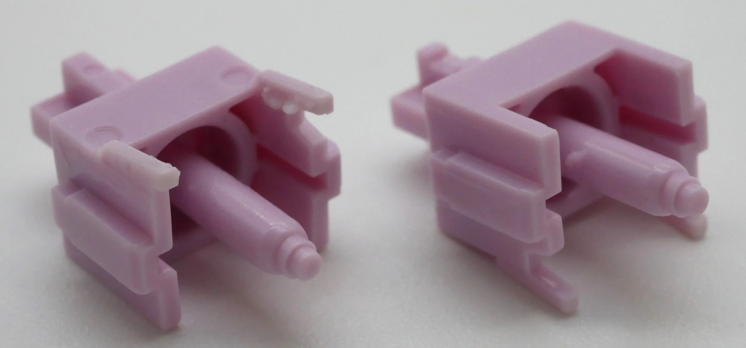 Moving next to the lilac colored stems of the Keygeek Athenas, I can say that these are definitely not pink colored as the initial marketing for these switches would suggest, and are instead a very light, pale lilac/lavender color. Overall, the design of the Athena stems is one that is rather simple and has hardly anything unexpected or unknown about it save for the composition of Keygeek’s mysterious “U4” plastic material. The stems feature full length, non-tapered slider rails, mold ejector circles on the front plate of the stem above its linear legs, and a double-tiered center pole that is only barely longer than the average at 13.29 mm in total length. In addition to all of these expected and commonplace features, there’s trace amounts of factory lubing on all faces of the stems that I inspected. This, however, will likely not be able to be easily seen in the photos below as the lube is fairly light in viscosity and easily wipes off on the fingers when handling the stems.