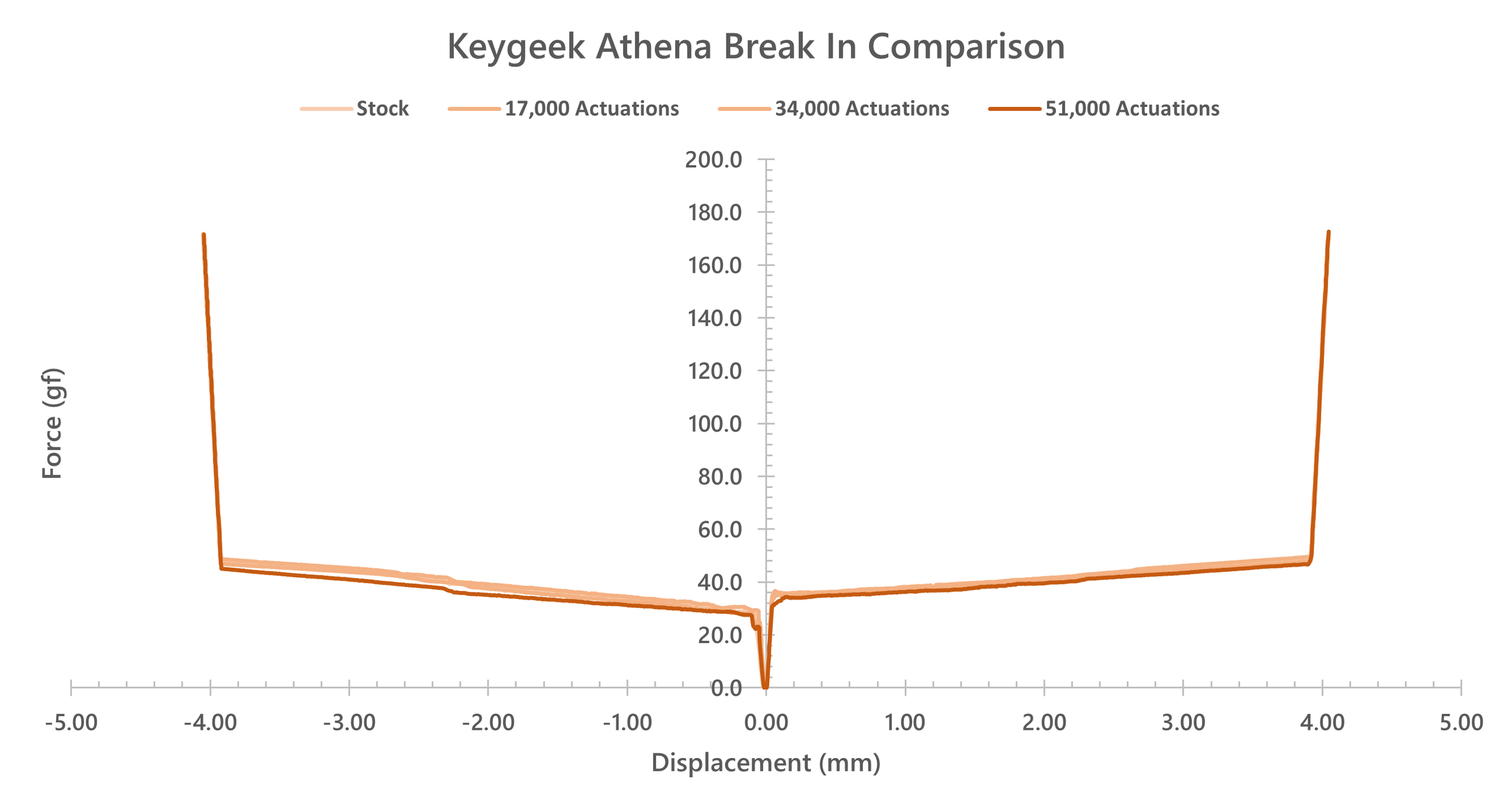 - Even more surprising is that the Keygeek Athenas did not shift anymore beyond that initial break in period, leaving both the 51,000 and 34,000 actuation lot to effectively feel the same as the first lot. While it’s not uncommon for switches to remain consistent from one section to the next, it’s been quite a while since I had a switch that managed to make it through the last two break in periods without morphing at all.