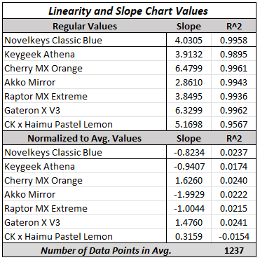 If you are just now seeing this section for the first time and are a bit confused as to what I am talking about when discussing ‘Slope’ and ‘Linearity’, I highly suggest checking out my article titled ‘On Differences in Linear Switches’ where I explain what this section is for and how it came to be! For a bit of a shorter answer, know that this is part of my ongoing attempt to better quantify and articulate differences between linear switches which have historically not been captured in discussions about them.