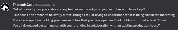Like many of you who read these reviews, I follow Novelkeys on various social media platforms so that I don’t miss out on any of their announcements for new product launches and restocks. And by “products”, I of course mean switches. (I personally have nothing against fun colored Keycult boards except for the fact that I can buy a lot of switches with fun colored Keycult board amounts of money…) In addition to organically coming across the Instagram announcement for the release of the new Classic Blue and Granite switches from Novelkeys on their July 10th, 2025 teaser date, I was also inundated with quite a few pings from friends and fans alike pointing me to this exact post. However, not all of these pings were meant to just flag me down as to the release of new switches. Instead, quite a few of these pings were immediately quick to point out the start of the second sentence on the text portion of this post that states that the Classic Blue and Granite switches are “Manufactured by TYPEPLUS…” Well who the hell is TYPEPLUS? Being unable to answer who this new and mysterious switch manufacturer was, I carried out a quick search online and found them to be a keyboard brand started sometime in the last handful of years by a keyboard enthusiast kevinplus that already had had a few solid collaborations on their relatively short list of work. Prior to their now obvious and very recent attachments to Novelkeys, and thus by extension now the Keycult brand as well, the previous TYPEPLUS engagements included boards designed by both Gok and Ai03 – both fairly discerning keyboard makers in their own right that have a tendency to be pretty picky about who they choose to associate with. Despite being a bit impressed by that initial resume and appearance, though, I was not able to find anything with respect to an injection molding facility, switch assembly production line, or really anything that indicated that they were what I would expect to be called a “switch manufacturer”. So what exactly was the phrase “manufactured by TYPEPLUS” even supposed to mean? I know that I’ve addressed the complexities that might exist out there in assigning origin of creation to switches before in my Red Velvet Switch Review, but at this most recent time this just kind of struck me as having the same sort of feeling as when those budget prebuilt keyboard brands – e.g. Hyte, Razer, etc. – get their switches made elsewhere while claiming that they “made them themselves”. Unlike these various brands, though, kevinplus appeared to be active on Discord. So after a day or so of trying to find any more information about the true origin of the Classic Blue and Granite switches, I said screw it and decided to reach out and ask him directly.