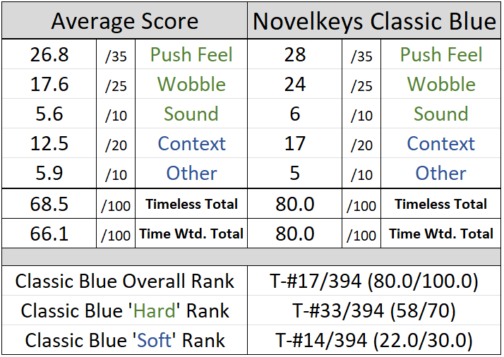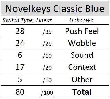 - Surprisingly, after 17,000 actuations the Novelkeys Classic Blue switches did not demonstrate any significant changes to their performance relative to that of their stock form. No change in wobble, smoothness, or sound of these switches was able to be detected in hand.