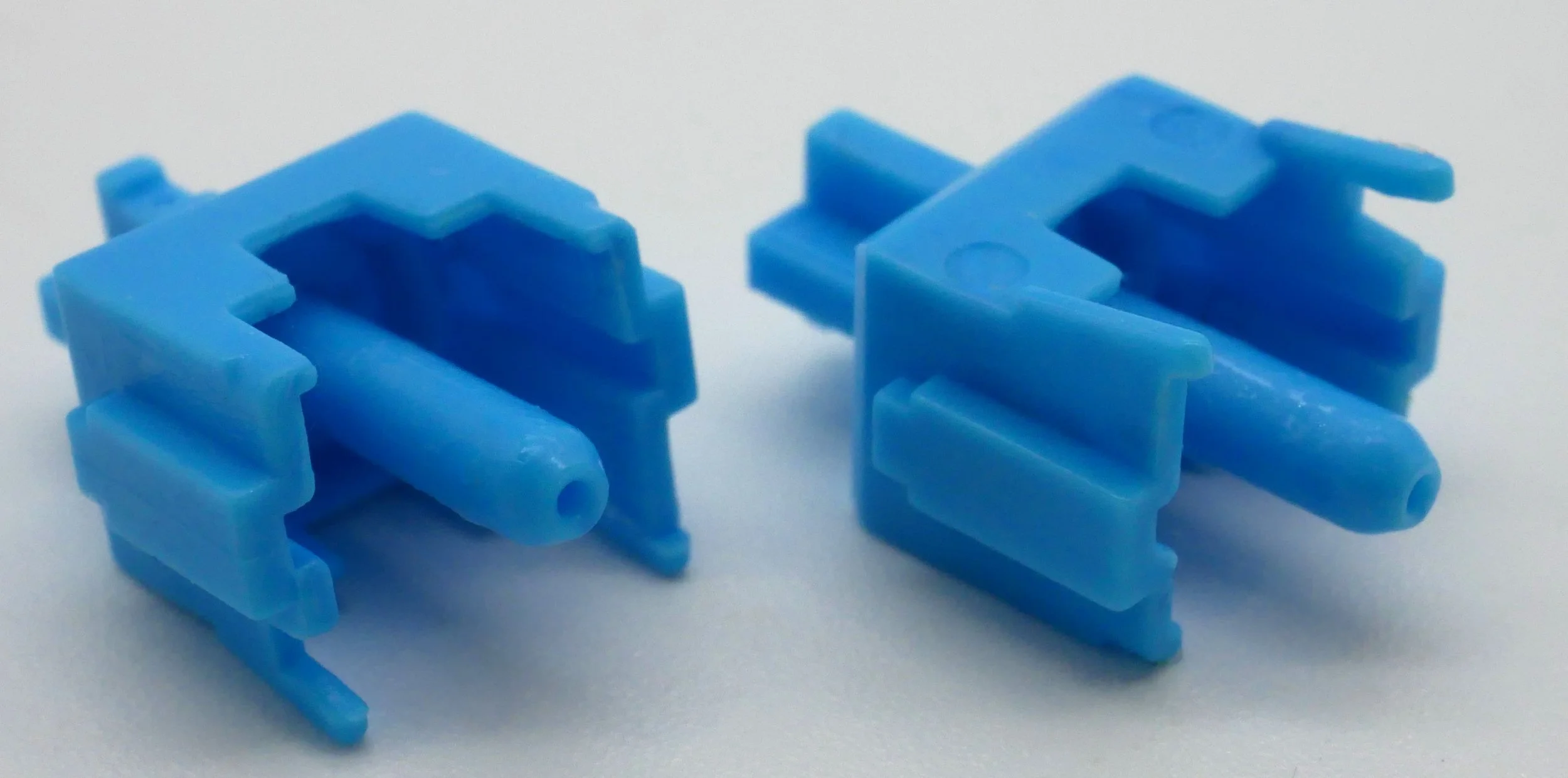 Figure 12: Front and back sides of the Novelkeys Classic Blue stems showing the squared capes on front and back plates, non-tapered slider rails, hole in the stem poles, and small 'nicks' out of the backplate corners near the base of the slider rails.