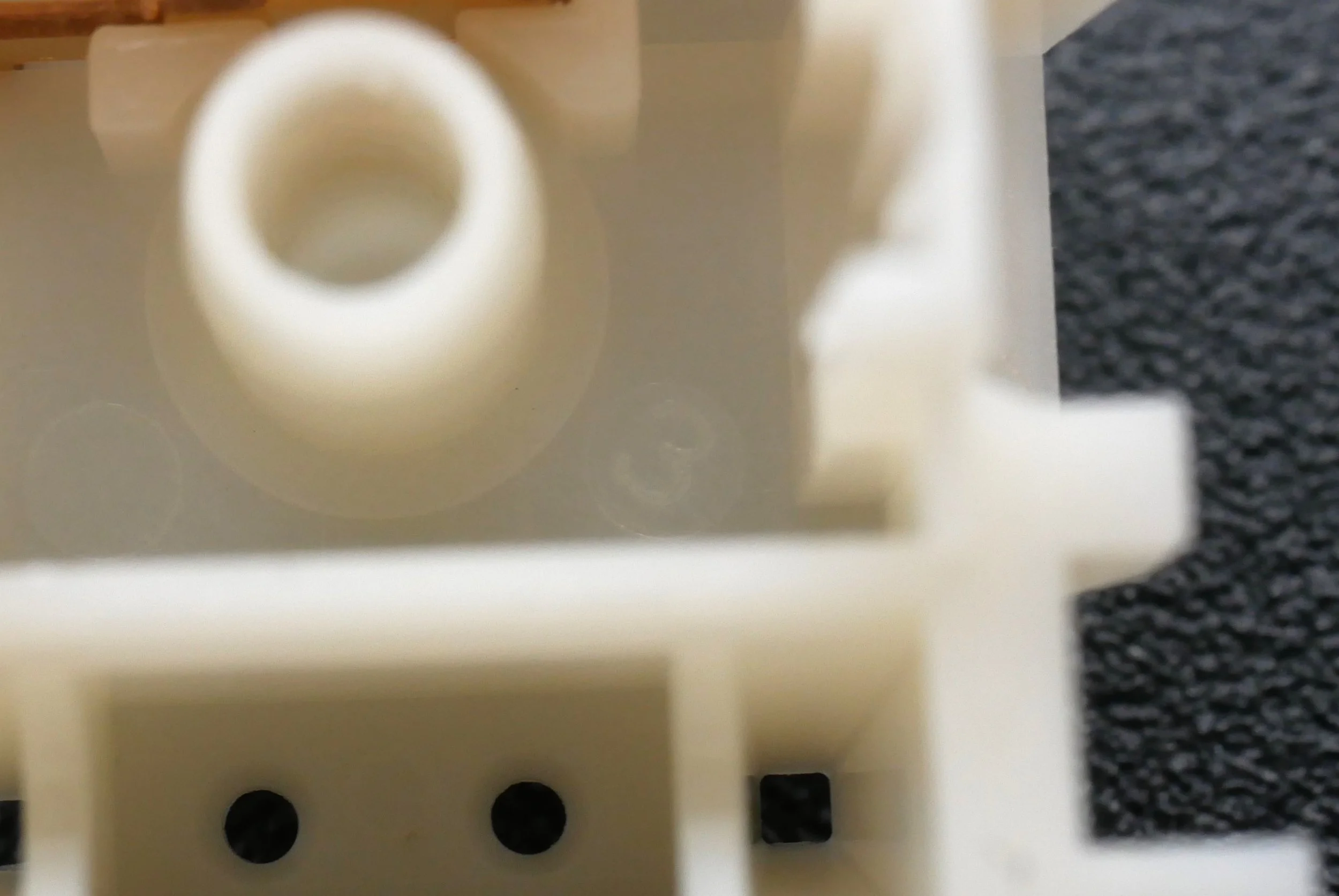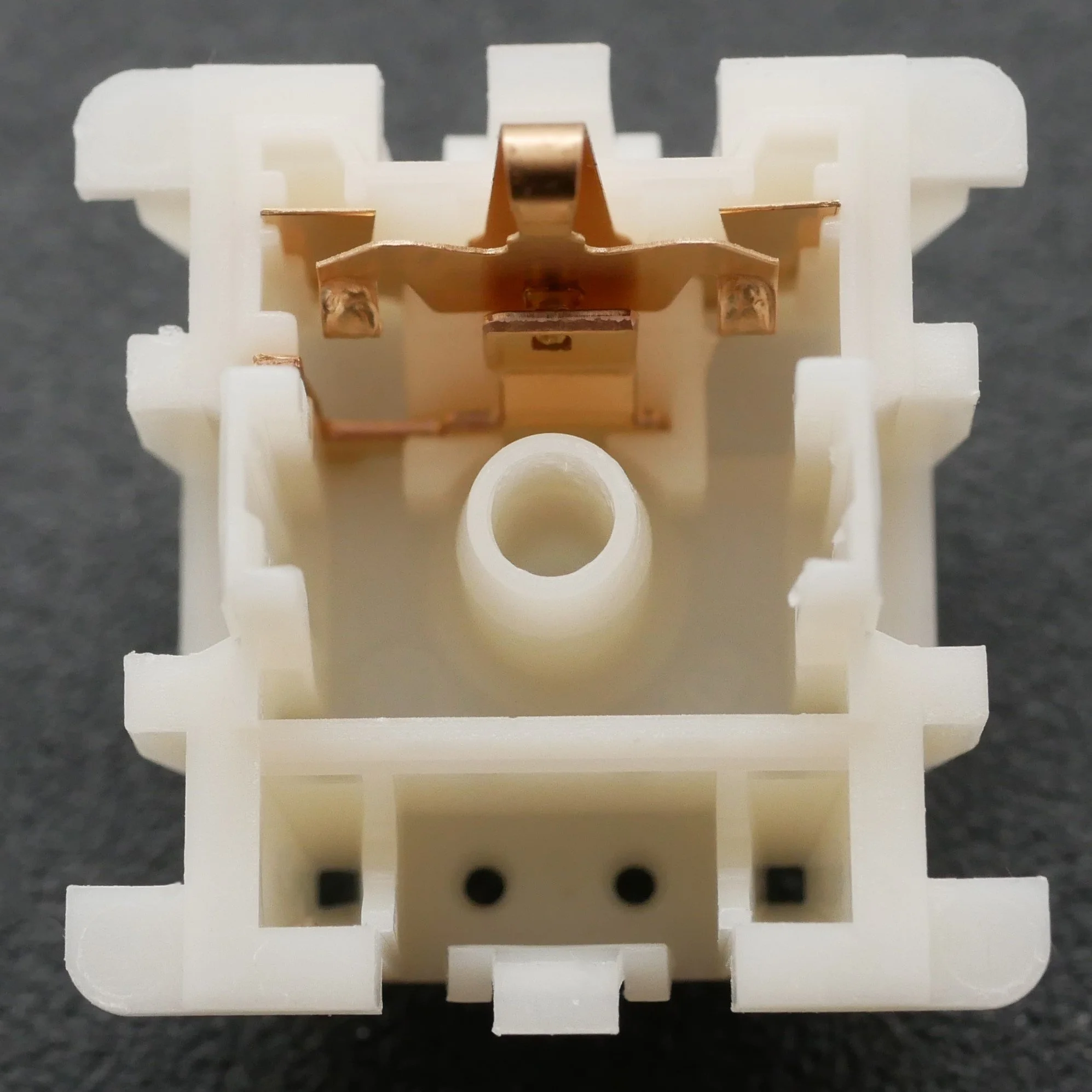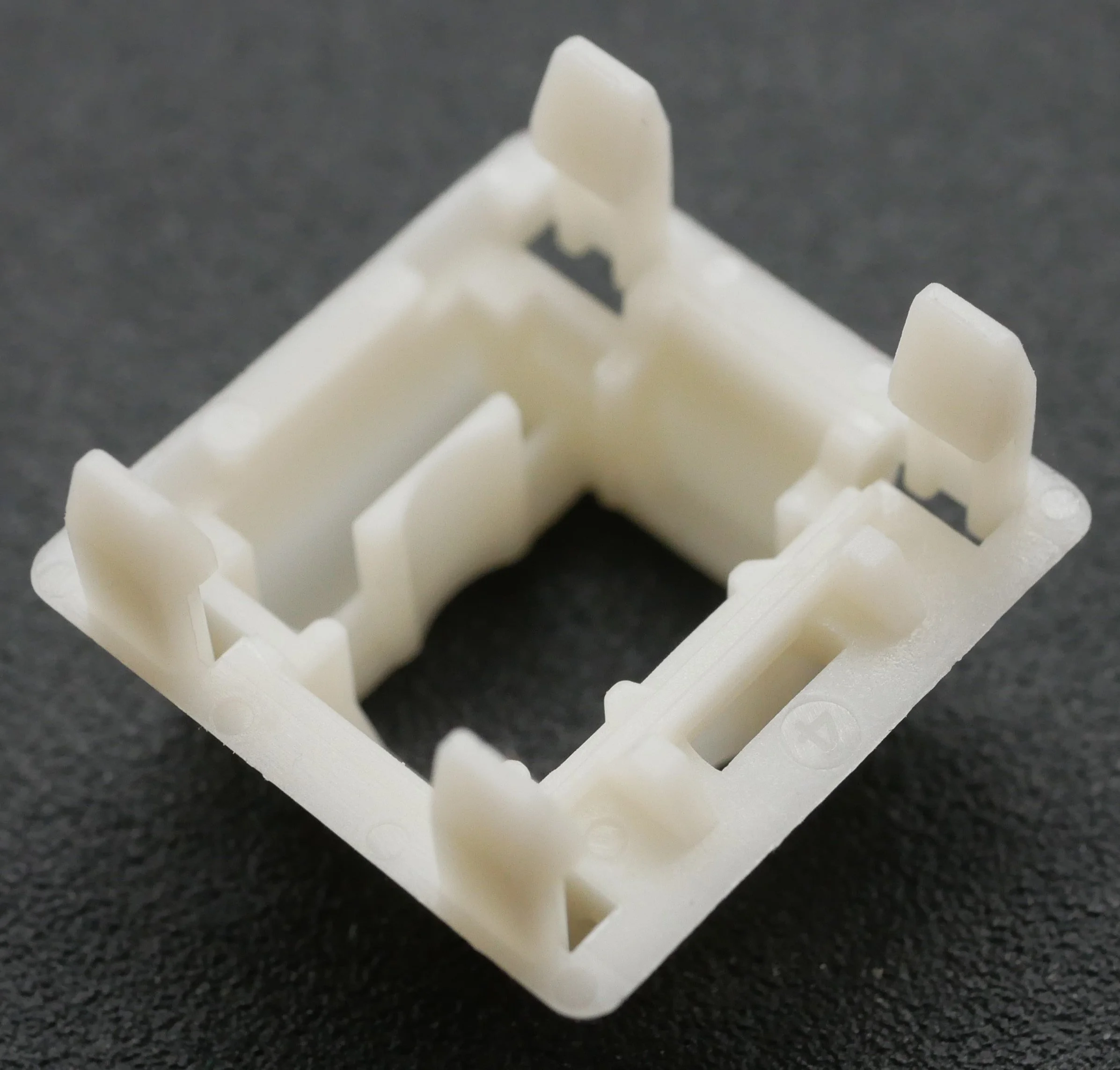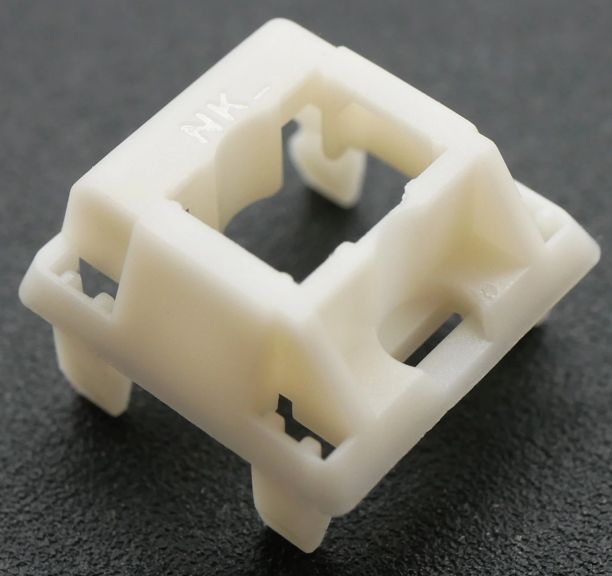 Figure 14: Zoomed in view of the Novelkeys Classic Blue bottom housing internals showing the unique location of the mold markings on these switch parts.