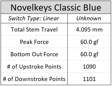 Figure 19: Numerical details regarding the force curve for the stock Novelkeys Classic Blue switches.