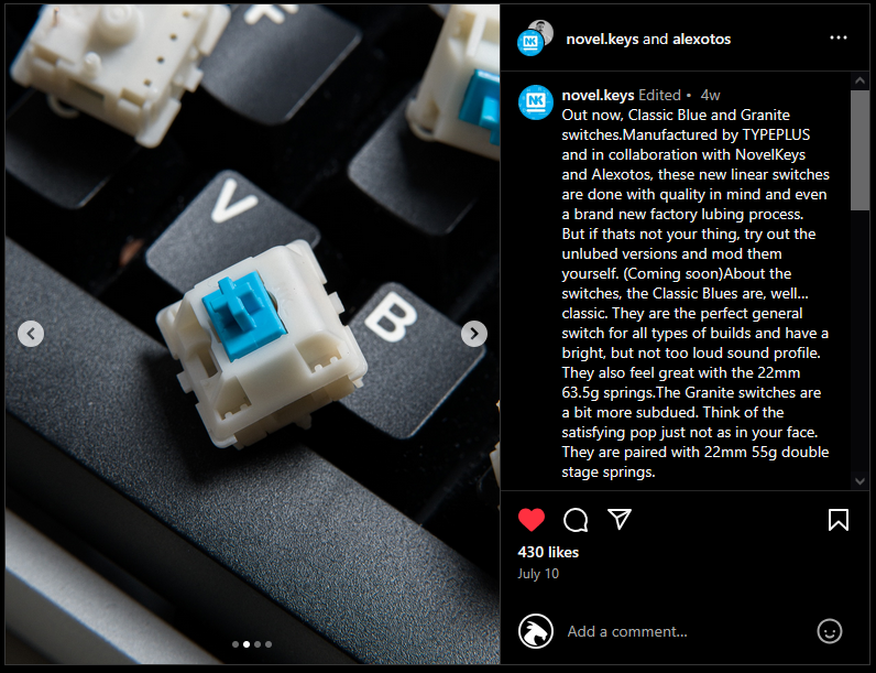 Figure 6: Instagram announcement debuting the launch of the Novelkeys Classic Blue and Alexotos Granite switches.