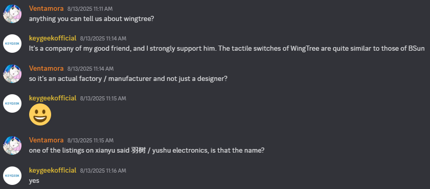 The range of how switch manufacturers choose to operate always makes formal documentation decisions such as these difficult on my part. Some come out of the gate swinging with a full store front, aggressive branding, photographic and contact-based proof of life, and more. Some slowly unfurl through each of those stages over years and years and eventually come to wider community acknowledgement and acceptance. And then there’s manufacturers like “Wingtree” (Dongguan Yushu Electronics) that just decide they’re going to crank out a shit ton of switches and use the sheer volume of what they’re producing and conversations that they’re generating as a mountain of second-hand evidence for their existence that could well outweigh the mole hill of first-hand evidence some other manufacturers have. If a single switch from new manufacturer were to pop up out of nowhere in the hands of a switch collector like XCJZ, a noted Chinese collector and designer of switches, that would be one thing to not think too strongly of. But if XCJZ were to have a collaborative switch design released with that same manufacturer, that would be something rather substantial to corroborate their reality. Fold in the additional facts that Unikeys’ owner has spoken highly of them and the manufacturer Keygeek has spoken highly of them in stating that the Wingtree factory is ran by a friend of theirs, and I’m not sure I can ask for a picture of the factory as “ultimate proof” without sounding utterly unreasonable. Wingtree very much seems like a real manufacturer just based on the sheer number of big names they seem to be connected to, and I’m willing to take the risk in saying they’re authentic based on that alone. The sheer rate at which Wingtree has hit the ground running in the western switch scene over the few, brief months since they first made their appearance (August 2025) suggests that there’s not only a lot more to come from them in the way of switches, but hopefully information and marketing as well. Despite being a smidge proactive on my behalf in formally recognizing them as a manufacturer, for once, I fully expect that they’ll release a switch at some point in 2026 that will have me writing an entire background section on them for a review and, to be entirely honest, I’m kind of excited about it.