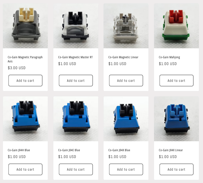 Figure 2: A handful of HE and Optical switch designs from Co-Gain/XUDA available from SwitchOddities' storefront as of the time of writing.