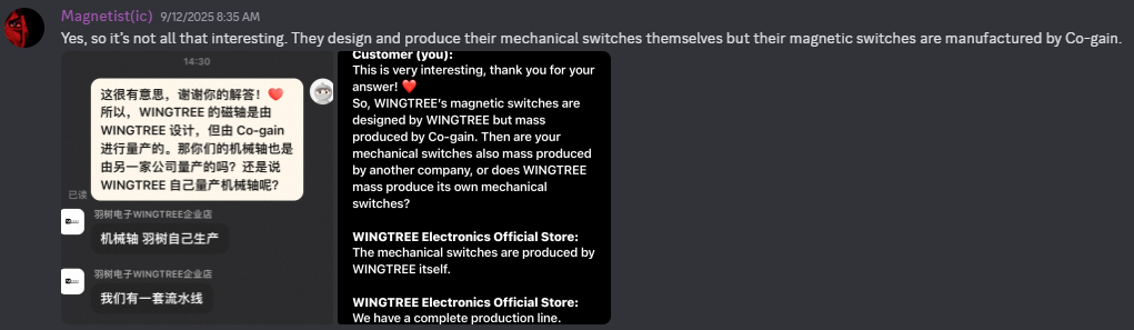 Figure 13: Screencap of direct conversations between SwitchModders' Discord user mimp6508 and Wingtree's customer support regarding their magnetic switches.